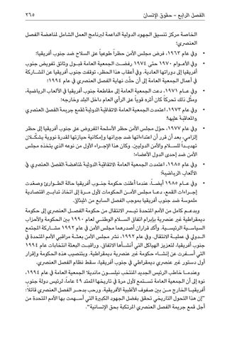 الخاصة مركز تنسيق الجهود الدولية الداعمة لربنامج العمل الشامل ملناهضة الفصل العنرصي؛ • •ويف عام ،1963فرض مجلس األمن حظرا ً طوعيا ً عىل السالح ضد جنوب أفريقيا؛ • •ويف األع�وام 1970حتى 1974رفض�ت الجمعية العامة قب�ول وثائق تفويض جنوب أفريقيا إىل دوراتها العادية .ويف أعقاب هذا الحظر ،توقفت جنوب أفريقيا عن املش�اركة يف أعمال الجمعية العامة إىل أن حلّت نهاية الفصل العنرصي يف عام 1994؛ • •ويف ع�ام ،1971دعت الجمعية العامة إىل مقاطعة جنوب أفريقيا يف األلعاب الرياضية، ومثّل ذلك تحركا ً كان أثره قويا ً عىل الرأي العام داخل البلد وخارجه؛ • •ويف عام ،1973اعتمدت الجمعية العامة االتفاقية الدولية لقمع جريمة الفصل العنرصي واملعاقبة عليها؛ • •ويف عام ،1977ح ّول مجلس األمن حظر األسلحة املفروض عىل جنوب أفريقيا إىل حظر إلزامي ،بعد أن قرر أن اعتداءاتها ضد جريانها وإمكانية حيازتها لقدرة نووية ّ يشكـالن تهديـدا ً للسلام واألمن الدوليني .وكان هذا اإلج�راء األول من نوعه الذي يتخذه مجلس األمن ضد إحدى الدول األعضاء؛ • •ويف عام ،1985اعتمدت الجمعية العامة االتفاقية الدولية ملناهضة الفصل العنرصي يف األلعاب الرياضية؛ • •ويف ع�ام 1985أيض�اً ،عندما أعلنت حكومة جن�وب أفريقيا حالة الط�وارئ وص ّعدت إج�راءات القمع ،دع�ا مجلس األم�ن الحكومات ألول م�رة إىل اتخاذ تدابير اقتصادية ملموسة ضد جنوب أفريقيا بموجب الفصل السابع من امليثاق. وبدع�م كامل من األمم املتحدة تيسر االنتقال من حكومة الفص�ل العنرصي إىل حكومة ديمقراطية غري عنرصية بإبرام اتفاق السلام الوطن�ي لعام 1990بني الحكومة واألحزاب السياس�ية الرئيس�ية .وأكد قراران أصدرهما مجلس األمن يف عام 1992مش�اركة املجتمع ال�دويل يف عملي�ة االنتقال .ويف عام ،1992نرش مجلس األمن بعث�ة مراقبي األمم املتحدة يف جنوب أفريقيا ،لتعزيز الهياكل التي أنش�أها االتفاق .وراقب�ت البعثة انتخابات عام 1994 التي أس�فرت عن إنش�اء حكومة غري عنرصية ديمقراطية .وبتنصيب هذه الحكومة وإقرار أول دستور غري عنرصي ديمقراطي يف جنوب أفريقيا ،سقط نظام الفصل العنرصي. وعندم�ا خاطب الرئيس الجديد املنتخب نيلس�ون مانديال الجمعية العامة يف عام ،1994 نوه إىل أن الجمعية العامة تس�تمع ألول مرة يف تاريخها املمتد 49عاماً ،لرئيس دولة جنوب أفريقي�ا الخارج م�ن بني صفوف األغلبية األفريقية .ورحب بدح�ر الفصل العنرصي قائالً: “إن هذا التحول التاريخي تحقق بفضل الجهود الكبرية التي أس�همت بها األمم املتحدة من أجل قمع جريمة الفصل العنرصي املرتكبة بحق اإلنسانية”.