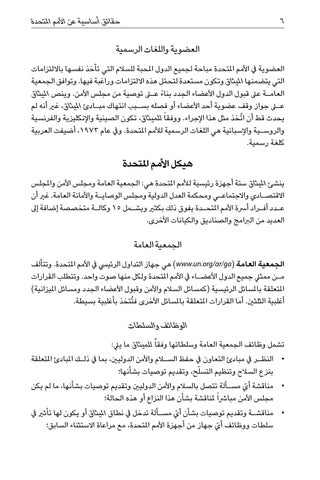 الجمعية العامة الجمعية العامة ( )www.un.org/ar/gaهي جهاز التداول الرئييس يف األمم املتحدة .وتتألف م�ن ممثيل جميع الدول األعض�اء يف األمم املتحدة ولكل منها صوت واحد .وتتطلب القرارات املتعلقة باملسائل الرئيسية (كمسائل السالم واألمن وقبول األعضاء الجدد ومسائل امليزانية) أغلبية الثلثني .أما القرارات املتعلقة باملسائل األخرى ف ُتتخذ بأغلبية بسيطة.