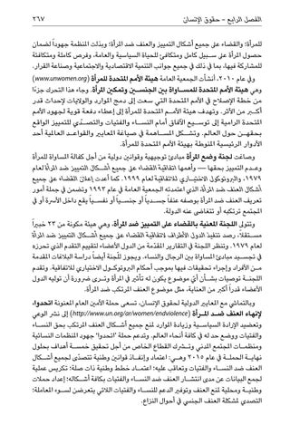 للمرأة؛ والقضاء عىل جميع أشكال التمييز والعنف ضد املرأة؛ وبذلت املنظمة جهودا ً لضمان حصول املرأة عىل س�بيل كامل ومتكافئ للحياة السياسية والعامة ،وفرص كاملة ومتكافئة للمشاركة فيها ،بما يف ذلك يف جميع جوانب التنمية االقتصادية واالجتماعية وصناعة القرار. ويف عام ،2010أنشأت الجمعية العامة هيئة األمم املتحدة للمرأة ()www.unwomen.org وهي هيئة األمم املتحدة للمس�اواة بني الجنسين وتمكني املرأة .وجاء هذا التحرك جزءًا من خطة اإلصالح يف األمم املتحدة التي سعت إىل دمج املوارد والواليات إلحداث قدر أكبر من األثر .وتهدف هيئة األم�م املتحدة للمرأة إىل إعطاء دفعة قوية لجهود األمم املتحدة الرامية إىل توس�يع اآلفاق أمام النس�اء والفتيات والتص�دّ ي للتمييز الواقع بحقه�ن حول العالم .وتش�كل املس�اهمة يف صياغة املعايري والقواع�د العاملية أحد األدوار الرئيسية املنوطة بهيئة األمم املتحدة للمرأة. وصاغت لجنة وضع املرأة مبادئ توجيهية وقوانني دولية من أجل كفالة املساواة للمرأة وع�دم التمييز بحقها — وأهمها اتفاقية القضاء عىل جميع أش�كال التمييز ضد املرأة لعام ،1979والربوتوكول االختي�اري لالتفاقية لعام .1999كما أعدت إعالن القضاء عىل جميع أشكال العنف ضد املرأة ،الذي اعتمدته الجمعية العامة يف عام 1993وتضمن يف جملة أمور تعريف العنف ضد املرأة بوصفه عنفا ً جس�ديا ً أو جنس�يا ً أو نفس�يا ً يقع داخل األرسة أو يف املجتمع ترتكبه أو تتغاىض عنه الدولة. وتتوىل اللجنة املعنية بالقضاء عىل التمييز ضد املرأة ،وهي هيئة مكونة من 23خبريا ً مس�تقالً ،رصد تنفيذ الدول األطراف التفاقية القضاء عىل جميع أش�كال التمييز ضد املرأة لعام .1979وتنظر اللجنة يف التقارير املقدّمة من الدول األعضاء لتقييم التقدم الذي تحرزه يف تجس�يد مبادئ املساواة بني الرجال والنساء .ويجوز للّجنة أيضا ً دراسة البالغات املقدمة م�ن األفراد وإجراء تحقيقات فيها بموجب أحكام الربوتوك�ول االختياري لالتفاقية .وتقدم أي موضوع يكون له تأثري يف املرأة وت�رى رضورة أن توليه الدول اللجن�ة توصيات بش�أن ّ األعضاء قدرا ً أكرب من العناية ،مثل موضوع العنف املرتكب ضد املرأة. وبالتمايش مع املعايري الدولية لحقوق اإلنسان ،تسعى حملة األمني العام املعنونة اتحدوا، إلنهاء العنف ض�د امل�رأة ( )http://www.un.org/ar/women/endviolenceإىل نرش الوعي وتعضيد اإلرادة السياس�ية وزيادة املوارد ملنع جميع أش�كال العنف املرتكب بحق النس�اء والفتيات ووضع حد له يف كافة أنحاء العالم .وتدعم حملة ‘اتحدوا’ جهود املنظمات النسائية ومنظم�ات املجتمع املدني وتشرك القطاع الخاص من أجل تحقيق خمس�ة أهداف بحلول نهاي�ة الحمل�ة يف عام 2015وه�ي :اعتماد وإنف�اذ قوانني وطنية تتصدّى لجميع أش�كال العنف ضد النس�اء والفتيات وتعاقب عليه؛ اعتم�اد خطط وطنية ذات صلة؛ تكريس عملية لجمع البيانات عن مدى انتش�ار العنف ضد النس�اء والفتيات بكافة أش�كاله؛ إعداد حمالت وطني�ة ومحلية ملنع العنف وتوفري الدعم للنس�اء والفتيات الالئي يتعرضن لس�وء املعاملة؛ التصدي ملشكلة العنف الجنيس يف أحوال النزاع.