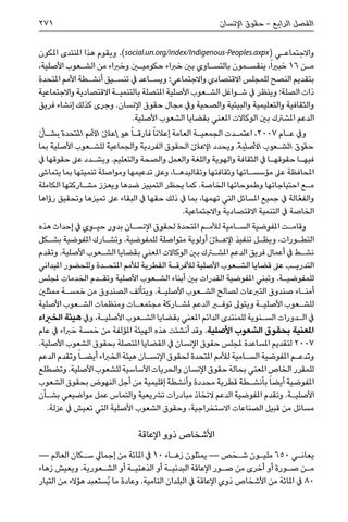 واالجتماع�ي ( .)social.un.org/index/Indigenous-Peoples.axpxويقوم هذا املنتدى املكون م�ن 16خبرياً ،ينقس�مون بالتس�اوي بني خرباء حكوميين وخرباء من الش�عوب األصلية، بتقديم النصح للمجلس االقتصادي واالجتماعي؛ ويس�اعد يف تنس�يق أنش�طة األمم املتحدة ذات الصلة؛ وينظر يف ش�واغل الش�عوب األصلية املتصلة بالتنمي�ة االقتصادية واالجتماعية والثقافية والتعليمية والبيئية والصحية ويف مجال حقوق اإلنسان .وجرى كذلك إنشاء فريق الدعم املشرتك بني الوكاالت املعني بقضايا الشعوب األصلية. ويف ع�ام ،2007اعتم�دت الجمعي�ة العامة إعالنا ً فارق�ا ً هو إعالن األمم املتحدة بش�أن حقوق الش�عوب األصلية .ويحدد اإلعالن الحقوق الفردية والجماعية للش�عوب األصلية بما فيه�ا حقوقه�ا يف الثقافة والهوية واللغة والعمل والصحة والتعليم .ويش�دد عىل حقوقها يف املحافظة عىل مؤسس�اتها وثقافتها وتقاليده�ا ،وعىل تدعيمها ومواصلة تنميتها بما يتماىش م�ع احتياجاتها وطموحاتها الخاصة .كما يحظر التمييز ضدها ويعزز مش�اركتها الكاملة والف ّعالة يف جميع املسائل التي تهمها ،بما يف ذلك حقها يف البقاء عىل تميزها وتحقيق رؤاها الخاصة يف التنمية االقتصادية واالجتماعية. وقام�ت املفوضية الس�امية لألم�م املتحدة لحقوق اإلنس�ان بدور حي�وي يف إحداث هذه التط�ورات ،ويظ�ل تنفيذ اإلعلان أولوية متواصلة للمفوضية .وتش�ارك املفوضية بش�كل نش�ط يف أعمال فريق الدعم املشترك بني الوكاالت املعني بقضايا الش�عوب األصلية .وتقدم التدري�ب عىل قضايا الش�عوب األصلية لألفرق�ة القطرية لألمم املتح�دة وللحضور امليداني للمفوضي�ة .وتبني املفوضية القدرات بني أبناء الش�عوب األصلية وتق�دم الخدمات ملجلس أمن�اء صندوق التربعات لصالح الش�عوب األصلي�ة .ويتألف الصندوق من خمس�ة ممثلني للش�عوب األصلي�ة ويتوىل توفير الدعم ملش�اركة مجتمع�ات ومنظمات الش�عوب األصلية يف ال�دورات الس�نوية للمنتدى الدائم املعني بقضايا الش�عوب األصلي�ة ،ويف هيئة الخرباء املعنية بحقوق الشعوب األصلية .وقد أنشئت هذه الهيئة املؤلفة من خمسة خرباء يف عام 2007لتقديم املساعدة ملجلس حقوق اإلنسان يف القضايا املتصلة بحقوق الشعوب األصلية. وتدع�م املفوضية الس�امية لألمم املتحدة لحقوق اإلنس�ان هيئة الخرباء أيض�ا ً وتقدم الدعم للمقرر الخاص املعني بحالة حقوق اإلنسان والحريات األساسية للشعوب األصلية .وتضطلع املفوضية أيضا ً بأنش�طة قطرية محددة وأنشطة إقليمية من أجل النهوض بحقوق الشعوب األصلي�ة .وتقدم املفوضية الدعم التخاذ مبادرات ترشيعية والتماس عمل مواضيعي بش�أن مسائل من قبيل الصناعات االستخراجية ،وحقوق الشعوب األصلية التي تعيش يف عزلة.
