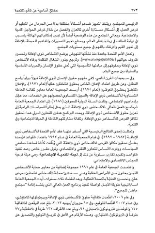 الرئيسي للمجتمع .ويتخذ التمييز ضدهم أش�كاال ً مختلفة بدءًا م�ن الحرمان من التعليم أو فرص العمل ،إىل أش�كال مس�ترتة أخرى كالعزل والفصل من خالل فرض الحواجز املادية واالجتماعية .ويعاني املجتمع من هذه الوضعية أيضا ً ألن تبديد إمكانياتهم الهائلة يتس�بب يف نهاية املطاف يف زيادة إفقار العالم .ويحتاج تغيري التصورات واملفاهيم املحيطة باإلعاقة إىل تغيري القيم واالرتقاء بالفهم يف جميع مستويات املجتمع. وتعمل األمم املتحدة جاهدة منذ نشأتها للنهوض بوضع األشخاص ذوي اإلعاقة وتحسني ظروف حياتهم ( .)www.un.org/disbilitiesوترجع جذور انشغال املنظمة برفاه األشخاص ذوي اإلعاقة وحقوقهم إىل مبادئها التأسيسية التي ُتعيل حقوق اإلنسان والحريات األساسية واملساواة بني جميع البرش. ويف س�بعينات القرن املايض ،القى مفهوم حقوق اإلنسان لذوي اإلعاقة قبوال ً دوليا ً واسع النطاق .وعن طريق اعتماد اإلعالن الخاص بحقوق املتخلفني عقليا ً (لعام ،)1971واإلعالن املتعل�ق بحق�وق املعوقين (لعام ،)1975أرس�ت الجمعي�ة العامة معايري كفال�ة املعاملة عجل املتس�اوية لألش�خاص ذوي اإلعاقة والسبيل املتس�اوي لحصولهم عىل الخدمات ،مما ّ بإدماجهم االجتماعي .وقادت الس�نة الدولية للمعوقني ( ،)1981إىل اعتماد الجمعية العامة لربنام�ج العمل العاملي لألش�خاص ذوي اإلعاقة ،ال�ذي يمثل إطارا ً للسياس�ات الرامية إىل تعزيز حقوق األش�خاص ذوي اإلعاقة .ويحدد الربنامج هدفني للتعاون الدويل هما :تحقيق تكافؤ الفرص لألش�خاص ذوي اإلعاقة ،وكفالة مشاركتهم الكاملة يف الحياة االجتماعية ويف التنمية. وتمثل�ت إحدى النتائج الرئيس�ية التي أس�فر عنه�ا عقد األمم املتحدة لألش�خاص ذوي اإلعاق�ة ( ،)1992 - 1983يف قيام الجمعية العامة يف ع�ام 1993باعتماد القواعد املوحدة بش�أن تحقيق تكافؤ الفرص لألش�خاص ذوي اإلعاقة ،التي ُو ّظفت كأداة ملساعدة صانعي السياس�ات ووفرت األس�اس للتعاون التقني واالقتصادي .وتوىل مق�رر خاص رصد تنفيذ القواع�د وتقديم تقارير س�نوية عن ذلك إىل لجنة التنمي�ة االجتماعية ،وهي هيئة فرعية للمجلس االقتصادي واالجتماعي. واعتم�دت الجمعية العامة يف عام 1991مجموعة إضافية من معايري حماية األش�خاص الذي�ن يعانون م�ن األمراض العقلية وه�ي — مبادئ حماية األش�خاص املصابني بمرض عقيل وتحسين العناية بالصحة العقلية .وبعد انقضاء ثالث س�نوات ،أيدت الجمعية العامة استراتيجية طويلة األج�ل ملواصلة تنفيذ برنامج العمل العاملي الذي ينش�د إقامة “مجتمع حاضن للجميع”. ويف عام ،2006اع ُتمدت اتفاقية حقوق األش�خاص ذوي اإلعاقة وبروتوكولها االختياري، ويف ع�ام 2007اف ُتتحا للتوقيع .ويف 15حزيران/يونيه ،2013بلغ عدد املو ّقعني لالتفاقية 155واملوقعين للربوتوكول االختياري ،91وبلغ عدد األطراف 132طرفا ً يف االتفاقية و77 طرف�ا ً يف الربوتوكول االختياري .وه�ذه األرقام هي األعىل يف تاري�خ التوقيع والتصديق عىل