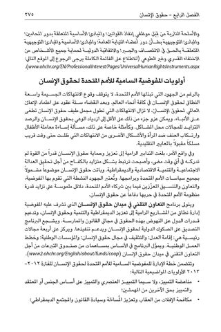 أولويات املفوضية السامية لألمم املتحدة لحقوق اإلنسان بالرغم من الجهود التي تبذلها األمم املتحدة ،ال يتوقف وقوع االنتهاكات الجس�يمة واس�عة النطاق لحقوق اإلنس�ان يف كافة أنحاء العالم .وبعد انقضاء س�تة عقود عىل اعتماد اإلعالن العاملي لحقوق اإلنس�ان ،ال تزال االنتهاكات التي تطول مجمل طيف حقوق اإلنسان تطغى على األنب�اء .ويمكن عزو جزء من ذلك عىل األقل إىل ازدياد الوعي بحقوق اإلنس�ان والرصد املتزاي�د للمجاالت محل املش�اكل .وكأمثلة خاصة عىل ذلك ،مس�ألة إس�اءة معاملة األطفال وارت�كاب العنف ضد املرأة واألش�كال األخ�رى من االنتهاكات التي ظل�ت حتى وقت قريب مسلكا ً مقبوال ً باملعايري التقليدية. ويف واقع األمر ،بلغت التدابري الرامية إىل تعزيز وحماية حقوق اإلنس�ان قدرا ً من القوة لم أي وقت مىض ،وأصبحت ترتبط بش�كل متزايد بالكف�اح من أجل تحقيق العدالة تدرك�ه يف ّ االجتماعي�ة والتنمي�ة االقتصادية والديمقراطية .وباتت حقوق اإلنس�ان موضوعا ً مش�موال ً بجميع سياس�ات األمم املتحدة وبرامجها .و ُتعترب الجهود النشطة التي تقوم بها املفوضية، والتعاون والتنس�يق املع ّززين فيما بني رشكاء األمم املتحدة ،دالئل ملموس�ة عىل تزايد قدرة منظومة األمم املتحدة يف حربها دفاعا ً عن حقوق اإلنسان. ويتوىل برنامج التعاون التقني يف ميدان حقوق اإلنس�ان الذي ترشف عليه املفوضية إدارة نطاق من املش�اريع الرامية إىل تعزيز الديمقراطية والتنمية وحقوق اإلنسان ،وتدعيم ق�درات الدول عىل النهوض بهذه الحقوق يف مجايل القانون واملمارس�ة .ويش�جع الربنامج التصديق عىل الصكوك الدولية لحقوق اإلنس�ان ويدع�م تنفيذها .ويركز عىل أربعة مجاالت رئيس�ية هي :إقامة العدل؛ والتثقيف يف مجال حقوق اإلنسان؛ واملؤسسات الوطنية؛ وخطط العم�ل الوطني�ة .ويم َّول الربنامج يف األس�اس بمس�اهمات من صن�دوق التربعات من أجل التعاون التقني يف ميدان حقوق اإلنسان (.)www2.ohchr.org/English/about/funds/coop وتتضمن خطة اإلدارة للمفوضية الس�امية لألمم املتحدة لحقوق اإلنس�ان للفرتة -2012 2013األولويات املواضيعية التالية: • •مناهضة التمييز ،وال س�يما التميي�ز العنرصي والتمييز عىل أس�اس الجنس أو املعتقد والتمييز بحق اآلخرين من املهمشني؛ • •مكافحة اإلفالت من العقاب وتعزيز املُساءَلة وسيادة القانون واملجتمع الديمقراطي؛