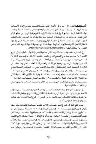 ش�هدت القارة األوروبية باكورة أعمال األمم املتحدة املنس�قة لتقديم اإلغاثة اإلنس�انية وسط ظروف الخراب والترشيد الشامل للبرش اللذين أوقعتهما الحرب العاملية الثانية ،وبعدها تولت املنظمة قيادة املجتمع الدويل يف االستجابة للكوارث الطبيعية والكوارث من صنع البرش التي تتجاوز يف مداها قدرات الس�لطات الوطنية بمفردها .ويف الوقت الحارض ،باتت املنظمة الجه�ة الرئيس�ية لتقديم اإلغاثة يف حاالت الطوارئ وتوفري املس�اعدة الطويلة األجل ،والجهة الح ّفازة للعمل الذي تضطلع به الحكومات ووكاالت الغوث وجهة الدعوة لتدعيم األش�خاص املترضرين بحاالت الطوارئ (.)http://www.un.org/ar/humanitarian ويف الس�نوات األخيرة ،دفعت الكوارث التي صنعها البرش والك�وارث الطبيعية إىل نزوح املاليين من ديارهم .وما برح املجتمع الدويل يش�عر بالقل�ق إزاء ترشيد قطاعات كاملة من الس�كان نتيجة للحروب وح�ركات التمرد يف أفغانس�تان والصوم�ال والجمهورية العربية الس�ورية ويف بل�دان أخرى .وعالوة عىل ذل�ك ،وقعت يف أثناء العقد امل�ايض وحده ثالث من الكوارث الطبيعية العرش األشد فتكا ً يف املائة سنة املاضية وهي — تسونامي املحيط الهندي يف ع�ام ،2004وإعص�ار نرج�س يف ميانمار يف عام ،2008وزل�زال هايتي يف عام .2010 وحصدت هذه الجائحات أرواح زهاء 600 000نسمة .ويف العقد املايض بلغت نسبة القتىل من البلدان النامية ج ّراء الكوارث الطبيعية 98يف املائة من إجمايل ضحايا هذه الكوارث — وهو رقم هائل يشير إىل الكيفية التي يتسبب بها الفقر والضغوط السكانية والرتدي البيئي يف تفاقم املعاناة اإلنسانية. ويف مواجه�ة النزاعات وتصاعد الكلفة البرشية واملالي�ة للكوارث الطبيعية ،تنخرط األمم املتحدة عىل جبهتني .فمن ناحية ،تو ّفر مساعدة اإلغاثة الفورية للمنكوبني وتفعل ذلك أساسا ً