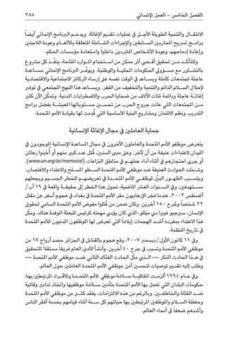 حماية العاملني يف مجال اإلغاثة اإلنسانية يتعرض موظفو األمم املتحدة والعاملون اآلخرون يف مجال املساعدة اإلنسانية املوجودون يف امليدان العتداءات عنيفة من آن آلخر .وعىل مدى السننيُ ،قتل عدد كبري منهم أو أُخذوا رهائن أو جرى احتجازهم يف أثناء أداء عمله�م يف مناطق النزاعات (.)www.un.org/ar/memorial وش�ملت الحوادث العنيفة ضد موظفي األمم املتحدة الس�طو املس�لح واالعتداء واالغتصاب. ويتس�بب الظه�ور نِّ البي ملوظف�ي األمم املتح�دة يف تعريضه�م للخطر الجس�يم ويجعلهم مس�تهدفني .ويف الس�نوات العرش املاضية ،تحول هذا الخطر إىل حقيق�ة واقعة يف 19آب/ فجر اإلرهابيون مقر األمم املتحدة يف بغداد يف هجوم أسفر عن مقتل أغسطس ،2003عندما ّ وجرح 150آخرين .وكان ضمن من ُقتلوا مفوض األمم املتحدة السامي لحقوق 22شخصا ً ُ اإلنسان ،سريجيو فيريا دي ميللو ،الذي كان يؤدي مهمته كرئيس للبعثة املوفدة هناك .ومثّل هذا االعتداء بمفرده أش�د الهجمات إيالما ً التي تعرض لها املوظفون املدنيون لألمم املتحدة يف تاريخ املنظمة. ويف 11كانون األول/ديسمرب ،2007وقع هجوم بالقنابل يف الجزائر حصد أرواح 17من موظفي األمم املتحدة وتسبب يف جرح 40آخرين .وأنشأ األمني العام فريقا ً مستقالً للتحقيق يف ه�ذا الحادث املنكر — ال�ذي مثّل الحادث الفتّاك الثاني ض�د موظفي األمم املتحدة — وطلب إليه تقديم توصيات لتحسني أمن موظفي األمم املتحدة العاملني حول العالم. ويف ع�ام 1994ألزم�ت اتفاقي�ة سلامة موظفي األمم املتح�دة واألف�راد املرتبطني بها، حكومات البلدان التي تعمل بها األمم املتحدة بتأمني سلامة موظفيها واتخاذ تدابري وقائية ض�د القتلة والخاطفين .وبالرغم من هذه االلتزامات ،يفقد كثير من موظفي األمم املتحدة وحفظة السلام واملوظفني املرتبطني بها حياتهم كل س�نة أثناء قيامهم بخدمة أفقر الناس وأشدهم ضعفا ً يف أنحاء العالم.