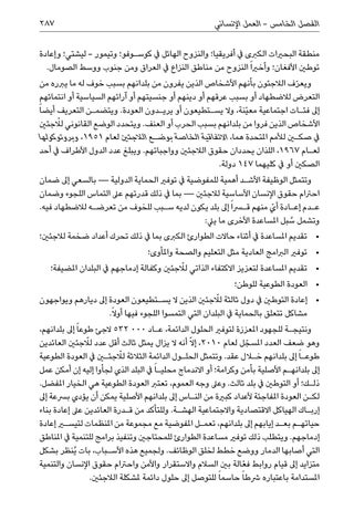 منطقة البحريات الكربى يف أفريقيا؛ والنزوح الهائل يف كوس�وفو؛ وتيمور -ليشتي؛ وإعادة توطني األفغان؛ وأخريا ً النزوح من مناطق النزاع يف العراق ومن جنوب ووسط الصومال. ويع ّرف الالجئون بأنهم األشخاص الذين يفرون من بلدانهم بسبب خوف له ما يربره من التعرض لالضطهاد أو بسبب عرقهم أو دينهم أو جنسيتهم أو آرائهم السياسية أو انتمائهم إىل فئ�ات اجتماعية معيّنة ،وال يس�تطيعون أو يري�دون العودة .ويتضم�ن التعريف أيضا ً األشخاص الذين فروا من بلدانهم بسبب الحرب أو العنف .ويتحدد الوضع القانوني للاّ جئني يف صكين لألمم املتحدة هما ،االتفاقية الخاصة بوض�ع الالجئني لعام ،1951وبروتوكولها لع�ام ،1967اللذان يحددان حقوق الالجئني وواجباتهم .ويبلغ عدد الدول األطراف يف أحد الصكني أو يف كليهما 147دولة. وتتمثل الوظيفة األش�د أهمية للمفوضية يف توفري الحماية الدولية — بالسعي إىل ضمان احرتام حقوق اإلنسان األساسية لالجئني — بما يف ذلك قدرتهم عىل التماس اللجوء وضمان أي منهم قسرا ً إىل بلد يكون لديه س�بب للخوف من تعرض�ه لالضطهاد فيه. ع�دم إع�ادة ّ وتشمل ُسبل املساعدة األخرى ما ييل: •تقديم املساعدة يف أثناء حاالت الطوارئ الكربى بما يف ذلك تحرك أعداد ضخمة لالجئني؛ •توفري الربامج العادية مثل التعليم والصحة واملأوى؛ •تقديم املساعدة لتعزيز االكتفاء الذاتي للاّ جئني وكفالة إدماجهم يف البلدان املضيفة؛ •العودة الطوعية للوطن؛ •إعادة التوطني يف دول ثالثة للاّ جئني الذين ال يس�تطيعون العودة إىل ديارهم ويواجهون مشاكل تتعلق بالحماية يف البلدان التي التمسوا اللجوء فيها أوالً. ونتيج�ة للجهود املعززة لتوفري الحلول الدائمة ،ع�اد 532 000الجئ طوعا ً إىل بلدانهم، املسجل لعام ،2010إالّ أنه ال يزال يمثل ثالث أقل عدد للاّ جئني العائدين وهو ضعف العدد ّ لاّ طوع�ا ً إىل بلدانهم خلال عقد .وتتمثل الحل�ول الدائمة الثالثة ل جئين يف العودة الطوعية إىل بلدانه�م األصلية بأمن وكرامة؛ أو االندماج محلي�ا ً يف البلد الذي لجأوا إليه إن أمكن عمل ذل�ك؛ أو التوطني يف بلد ثالث .وعىل وجه العموم ،تعترب العودة الطوعية هي الخيار املفضل. لك�ن العودة املفاجئة ألعداد كبرية من الن�اس إىل بلدانهم األصلية يمكن أن يؤدي برسعة إىل إرب�اك الهياكل االقتصادية واالجتماعية الهش�ة .وللتأكد من ق�درة العائدين عىل إعادة بناء حياته�م بع�د إيابهم إىل بلدانهم ،تعم�ل املفوضية مع مجموعة من املنظمات لتيسير إعادة إدماجهم .ويتطلب ذلك توفري مساعدة الطوارئ للمحتاجني وتنفيذ برامج للتنمية يف املناطق التي أصابها الدمار ووضع خطط لخلق الوظائف .ولجميع هذه األس�باب ،بات ُينظر بشكل متزايد إىل قيام روابط ف ّعالة بني السالم واالستقرار واألمن واحرتام حقوق اإلنسان والتنمية املستدامة باعتباره رشطا ً حاسما ً للتوصل إىل حلول دائمة ملشكلة الالجئني.