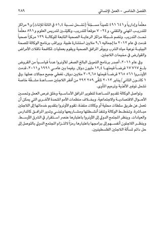 معلّما ً وإداريا ً و 491 641تلميذا ً مس�جالً (تش�مل نس�بة 51,4يف املائة لإلناث) و 9مراكز ّ للتدري�ب املهني والتقني ،و 7 024موقعا ً للتدريب ،وكليّتين لتدريس العلوم و 891معلّما ً تح�ت التدريب .وتضم ش�بكة مراكز الرعاي�ة الصحية التابعة للوكال�ة 139مركزا ً صحيا ً قدمت يف عام 2012ما إجماليه 9,6ماليني استشارة طبية .ويراقب برنامج الوكالة للصحة البيئي�ة نوعية مياه الرشب ويو ّفر املرافق الصحية ويقوم بعمليات ملكافحة ناقالت األمراض والقوارض يف مخيمات الالجئني. ويف عام ،2011أصدر برنامج التمويل البالغ الصغر لألونروا عددا ً قياس�يا ً من القروض بل�غ 17 717قرض�ا ً قيمته�ا 12,4مليون دوالر .وفيما بني عام�ي 1991و ،2011قدمت األون�روا 265 561قرضـا ً قيمتها 302,65ماليني دوالر ،تغطي جميع مجاالت عملها .ويف ّ 1كان�ون الثاني/يناير ّ 2013 مش�قة خاصة تلقى 292 259من أفقر الالجئني مس�اعدة تشمل توفري األغذية وترميم املأوى. وتواصل الوكالة تقديم املس�اعدة لتطوير املرافق األساس�ية وخلق فرص العمل وتحسني األح�وال االقتصادي�ة واالجتماعية .وبخلاف منظمات األمم املتحدة األخ�رى التي يمكن أن تعمل عن طريق سلطات محلية أو وكاالت منفذة ،تقوم األونروا بتقديم خدماتها إىل الالجئني مب�ارشة .وتخط�ط الوكالة وتنفذ أنش�طتها ومش�اريعها وتبن�ي وتدير املراف�ق كاملدارس والعيادات .وينظر املجتمع الدويل إىل األونروا باعتبارها عنرص اس�تقرار يف الرشق األوس�ط. وينظ�ر الالجئون أنفس�هم إىل برامجها باعتبارها رمزا ً اللت�زام املجتمع الدويل بالتوصل إىل حل دائم ملسألة الالجئني الفلسطينيني.
