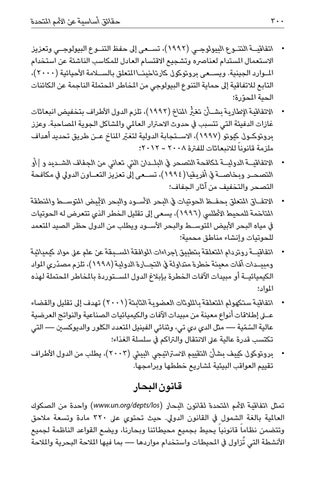 •اتفاقي�ة التن�وع البيولوج�ي ( ،)1992تس�عى إىل حفظ التن�وع البيولوج�ي وتعزيز االستعمال املستدام لعنارصه وتشجيع االقتسام العادل للمكاسب الناشئة عن استخدام امل�وارد الجينية .ويس�عى بروتوكول كارتاخين�ا املتعلق بالسلامة األحيائية (،)2000 التابع لالتفاقية إىل حماية التنوع البيولوجي من املخاطر املحتملة الناجمة عن الكائنات الحية املح ّورة؛ تغي املناخ ( ،)1992تلزم الدول األطراف بتخفيض انبعاثات •االتفاقية اإلطارية بش�أن رُّ غازات الدفيئة التي تتسبب يف حدوث االحرتار العاملي واملشاكل الجوية املصاحبة .وعزز بروتوك�ول كيوتو ( ،)1997االس�تجابة الدولية لتغيرّ املناخ ع�ن طريق تحديد أهداف ملزمة قانونا ً لالنبعاثات للفرتة 2012 - 2008؛ •االتفاقي�ة الدولي�ة ملكافحة التصحر يف البل�دان التي تعاني من الجفاف الش�ديد و/أو التصح�ر وبخاص�ة يف أفريقيا ( ،)1994تس�عى إىل تعزيز التع�اون الدويل يف مكافحة التصحر والتخفيف من آثار الجفاف؛ •االتف�اق املتعلق بحف�ظ الحوتيات يف البحر األس�ود والبحر األبيض املتوس�ط واملنطقة املتاخمة للمحيط األطليس ( ،)1996يسعى إىل تقليل الخطر الذي تتعرض له الحوتيات يف مياه البحر األبيض املتوس�ط والبحر األس�ود ويطلب من الدول حظر الصيد املتعمد للحوتيات وإنشاء مناطق محمية؛ •اتفاقي�ة روتردام املتعلقة بتطبيق إجراءات املوافقة املس�بقة عن علم عىل مواد كيميائية ومبي�دات آفات معينة خطرة متداولة يف التج�ارة الدولية ( ،)1998تلزم مصدّري املواد الكيميائي�ة أو مبيدات اآلفات الخطرة بإبالغ الدول املس�توردة باملخاطر املحتملة لهذه املواد؛ •اتفاقية ستكهولم املتعلقة بامللوثات العضوية الثابتة ( )2001تهدف إىل تقليل والقضاء على إطالقات أنواع معينة من مبيدات اآلفات والكيميائيات الصناعية والنواتج العرضية الس ّمية — مثل الدي دي تي ،وثنائي الفينيل املتعدد الكلور والديوكسني — التي عالية ّ تكتسب قدرة عالية عىل االنتقال والرتاكم يف سلسلة الغذاء؛ •بروتوكول كييف بشأن التقييم االسرتاتيجي البيئي ( ،)2003يطلب من الدول األطراف تقييم العواقب البيئية ملشاريع خططها وبرامجها.