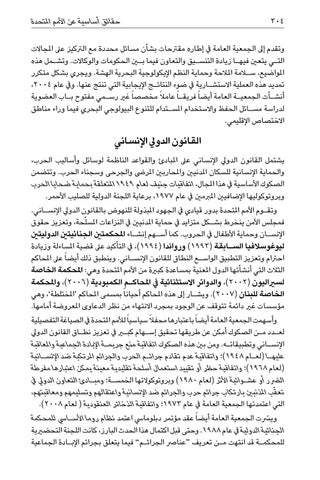 القانون الدويل اإلنساني يشتمل القانون الدويل اإلنساني عىل املبادئ والقواعد الناظمة لوسائل وأساليب الحرب، والحماية اإلنسانية للسكان املدنيني واملحاربني املرىض والجرحى وسجناء الحرب .وتتضمن الصكوك األساسية يف هذا املجال ،اتفاقيات جنيف لعام 1949املتعلقة بحماية ضحايا الحرب وبروتوكوليها اإلضافيني املربمني يف عام ،1977برعاية اللجنة الدولية للصليب األحمر. وتق�وم األمم املتحدة بدور قيادي يف الجهود املبذولة للنهوض بالقانون الدويل اإلنس�اني. فمجلس األمن ينخرط بش�كل متزايد يف حماية املدنيني يف النزاعات املسلّحة ،وتعزيز حقوق اإلنس�ان وحماية األطفال يف الحروب .كما أس�هم إنش�اء املحكمتني الجنائيتني الدوليتني ليوغوسالفيا الس�ابقة ( )1993ورواندا ( ،)1994يف التأكيد عىل قضية املساءلة وزيادة احرتام وتعزيز التطبيق الواس�ع النطاق للقانون اإلنس�اني .وينطبق ذلك أيضا ً عىل املحاكم الثالث التي أنشأتها الدول املعنية بمساعدة كبرية من األمم املتحدة وهي :املحكمة الخاصة لسرياليون ( ،)2002والدوائر االستثنائية يف املحاكـم الكمبودية ( ،)2006واملحكمة الخاصة للبنان ( .)2007ويش�ار إىل هذه املحاكم أحيانا ً بمسمى املحاكم ‘املختلطة’ ،وهي مؤسسات غري دائمة تتوقف عن الوجود بمجرد االنتهاء من نظر الدعاوى املعروضة أمامها. وأسهمت الجمعية العامة أيضا ً باعتبارها محفالً سياسيا ً لألمم املتحدة يف الصياغة التفصيلية لع�دد م�ن الصكوك أمكن عن طريقها تحقيق إس�هام كبير يف تعزيز نط�اق القانون الدويل اإلنس�اني وتطبيقات�ه .ومن بني هذه الصكوك اتفاقية منع جريم�ة اإلبادة الجماعية واملعاقبة عليه�ا (لع�ام )1948؛ واتفاقية عدم تقادم جرائ�م الحرب والجرائم املرتكبة ضد اإلنس�انية (لعام )1968؛ واتفاقية حظر أو تقييد استعمال أسلحة تقليدية معينة يمكن اعتبارها مفرطة الرضر أو عش�وائية األثر (لعام )1980وبروتوكوالتها الخمس�ة؛ ومب�ادئ التعاون الدويل يف تع ّقب املذنبني بارتكاب جرائم حرب والجرائم ضد اإلنسانية واعتقالهم وتسليمهم ومعاقبتهم، التي اعتمدتها الجمعية العامة يف عام 1973؛ واتفاقية الذخائر العنقودية ( لعام .)2008 ويست الجمعية العامة أيضا ً عقد مؤتمر دبلومايس اعتمد نظام روما األس�ايس للمحكمة رّ الجنائية الدولية يف عام .1988وحتى قبل اكتمال هذا الحدث البارز ،كانت اللجنة التحضريية للمحكم�ة قد انتهت م�ن تعريف “عنارص الجرائ�م” فيما يتعلق بجرائم اإلب�ادة الجماعية