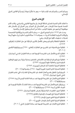 اإلرهاب الدويل ما انفكت األمم املتحدة تتص ّدى ملشكلة اإلرهاب يف جانبيها القانوني والسيايس .وكانت األمم املتحدة نفسها هدفا ً لإلرهاب .فمن أفغانستان إىل الجزائر ومن العراق إىل باكستان فقد موظفوها أرواحهم عىل خطوط الواجب ،دفاعا ً عن السالم وحقوق اإلنسان والتنمية. ومن�ذ عام ،1963ق�ام املجتمع الدويل — برعاي�ة األمم املتح�دة ووكاالتها املتخصصة والوكال�ة الدولي�ة للطاق�ة الذرية — بصياغ�ة 14صكا ً قانوني�ا ً عاملي�ا ً وزاد عليها أربعة تعديالت ،تستهدف كلها منع اإلرهاب وهي: َ املرتكبَة عىل متن الطائرات (طوكيو، • •االتفاقية املتعلقة بالجرائم وبعض األفعال األخرى )1963؛ • •اتفاقية منع االستيالء غري املرشوع عىل الطائرات (الهاي )1970 ،وبروتوكولها التكمييل ()2010؛ • •اتفاقي�ة قم�ع األعمال غير املرشوع�ة املوجهة ضد سلامة الطريان املدن�ي (مونرتيال، )1971؛ • •اتفاقية منع الجرائم املرتكبَة ضد األشخاص املتمتعني بحماية دولية ،بمن فيهم املوظفني الدبلوماسيني واملعاقبة عليها (نيويورك)1973 ،؛ • •االتفاقية الدولية ملناهضة أخذ الرهائن (نيويورك)1979 ،؛ • •اتفاقية الحماية املادية للمواد النووية (فيينا ،)1980 ،وتعديالتها ()2005؛ • •الربوتوك�ول املتعلق بقم�ع أعمال العنف غري املرشوعة يف املط�ارات التي تخدم الطريان املدني الدويل (مونرتيال)1988 ،؛ • •اتفاقية قمع األعمال غري املرشوعة املوجهة ضد سلامة املالحة البحرية (روما،)1988 ، وبروتوكولها ()2005؛ • •بروتوكول قمع األعمال غري املرشوعة املوجهة ضد سلامة املنش�آت الثابتة املوجودة عىل الجرف القاري (روما ،)1988 ،وبروتوكولها ()2005؛ • •اتفاقية تمييز املتفجرات البالستيكية بغرض كشفها (مونرتيال)1991 ،؛ • •االتفاقية الدولية ملنع الهجمات اإلرهابية بالقنابل ()1997؛ • •االتفاقية الدولية لقمع تمويل اإلرهاب ()1999؛ • •االتفاقية الدولية لقمع أعمال اإلرهاب النووي ()2005؛ • •اتفاقية قمع األعمال غري املرشوعة املوجهة ضد سالمة الطريان املدني (.)2010