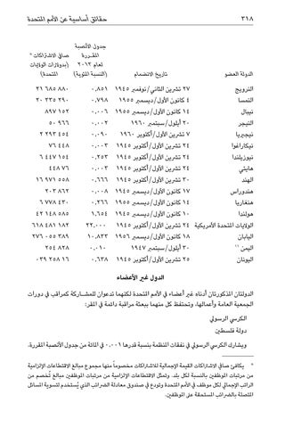 الدول غري األعضاء الدولتان املذكورتان أدناه غري أعضاء يف األمم املتحدة لكنهما تدعوان للمش�اركة كمراقب يف دورات الجمعية العامة وأعمالها ،وتحتفظ كل منهما ببعثة مراقبة دائمة يف املقر: الكريس الرسويل دولة فلسطني ويشارك الكريس الرسويل يف نفقات املنظمة بنسبة قدرها 0,001يف املائة من جدول األنصبة املقررة. * يكافئ صايف االشرتاكات القيمة اإلجمالية لالشرتاكات مخصوما ً منها مجموع مبالغ االقتطاعات اإللزامية من مرتبات املوظفني بالنسبة لكل بلد .وتمثل االقتطاعات اإللزامية من مرتبات املوظفني مبالغ ُتخصم من الراتب اإلجمايل لكل موظف يف األمم املتحدة وتودع يف صندوق معادلة الرضائب الذي يُستخدم لتسوية املسائل املتصلة بالرضائب املستحقة عىل املوظفني.