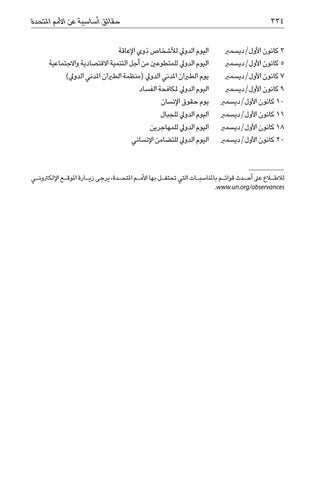 حقائق أساسية عن األمم املتحدة اليوم الدويل لألشخاص ذوي اإلعاقة اليوم الدويل للمتطوعني من أجل التنمية االقتصادية واالجتماعية يوم الطريان املدني الدويل (منظمة الطريان املدني الدويل) اليوم الدويل ملكافحة الفساد يوم حقوق اإلنسان اليوم الدويل للجبال اليوم الدويل للمهاجرين اليوم الدويل للتضامن اإلنساني