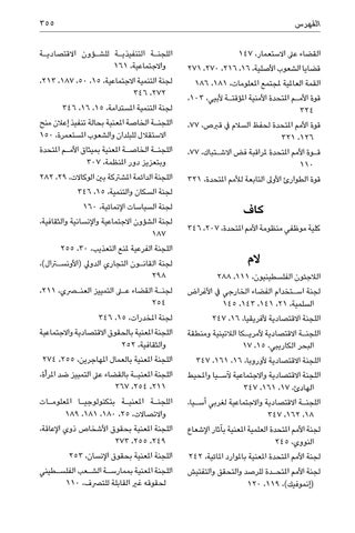 الم الالجئون الفلسطينيون288 ،111 ، لجنة اس�تخدام الفضاء الخارجي يف األغراض السلمية145 ،143 ،141 ،21 ، اللجنة االقتصادية ألفريقيا247 ،16 ، اللجن�ة االقتصادية ألمري�كا الالتينية ومنطقة البحر الكاريبي17 ،15 ، اللجنة االقتصادية ألوروبا347 ،161 ،16 ، اللجنة االقتصادية واالجتماعية آلس�يا واملحيط الهادئ347 ،161 ،17 ، اللجن�ة االقتصادية واالجتماعية لغربي آس�يا، 347 ،162 ،18 لجنة األمم املتحدة العلمية املعنية بآثار اإلشعاع النووي245 ، لجنة األمم املتحدة املعنية باملوارد املائية242 ، لجنة األمم املتح�دة للرصد والتحقق والتفتيش (إنموفيك)120 ،119 ،
