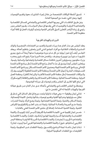 الدورات والهيئات الفرعية يعقد املجلس عىل مدار العام عدة دورات قصرية والعديد من االجتماعات التحضريية واملوائد املستديرة والحلقات النقاشية مع أفراد املجتمع املدني الذين يتصلون بتنظيم أعماله .ويعقد املجل�س أيض�ا ً يف تموز/يوليه من كل ع�ام دورة موضوعي�ة مدتها أربعة أس�ابيع ،يجري تناوبه�ا س�نويا ً بني نيويورك وجني�ف .وتتضمن هذه الدورة جزءًا رفيع املس�توى يحرضه وزراء حكوميون ومسؤولون آخرون ملناقشة مسائل اقتصادية واجتماعية وإنسانية رئيسية. ويتعاون املجلس أيضا ً وينسق إىل ح ّد ما أعمال برامج األمم املتحدة (مثل برنامج األمم املتحدة اإلنمائي وبرنامج األمم املتحدة للبيئة وصندوق األمم املتحدة للس�كان وبرنامج األمم املتحدة للمس�توطنات البرشية (موئل األمم املتحدة) ومنظمة األمم املتحدة للطفولة (اليونيس�يف))، وال�وكاالت املتخصصة (مثل منظمة األمم املتحدة لألغذي�ة والزراعة (الفاو) ،ومنظمة العمل الدولية ،ومنظمة الصحة العاملية ،ومنظمة األمم املتحدة للرتبية والعلم والثقافة (اليونسكو))، التي ترفع كلها تقارير إىل املجلس وتقدم توصيات إىل دوراته املوضوعية. ويضطل�ع املجلس االقتص�ادي واالجتماعي بأعماله على مدار العام ع�ن طريق هيئاته الفرعية والهيئات التابعة له التي تتضمن ما ييل: • •ثماني لجان وظيفية — وهي هيئات تداولية يتحدد دورها يف نظر املسائل التي تدخل يف نطاق مس�ؤوليتها وخرباتها الفنية وتقديم توصيات بشأنها وتشمل :اللجنة اإلحصائية، ولجنة السكان والتنمية ،ولجنة التنمية االجتماعية ،ولجنة وضع املرأة ،ولجنة املخدرات، ولجنة من�ع الجريمة والعدال�ة الجنائية ،ولجنة تس�خري العل�م والتكنولوجيا ألغراض التنمية ،ولجنة التنمية املستدامة ،إضافة إىل منتدى األمم املتحدة املعني بالغابات؛ • •خم�س لجان إقليمية ه�ي :اللجن�ة االقتصادية ألفريقيا (أدي�س أبابا ،إثيوبي�ا) ،واللجنة االقتصادي�ة واالجتماعية آلس�يا واملحيط الهادئ (بانك�وك ،تايلند) ،واللجن�ة االقتصادية واالجتماعي�ة ألوروب�ا (جني�ف) ،واللجن�ة االقتصادية ألمري�كا الالتيني�ة ومنطقة البحر الكاريبي (سانتياغو ،شييل) ،واللجنة االقتصادية واالجتماعية لغربي آسيا (بريوت ،لبنان)؛ • •ثلاث لجان دائم�ة :لجنة الربنامج والتنس�يق ،ولجنة املنظمات غير الحكومية ،ولجنة املفاوضات مع املنظمات الحكومية الدولية؛