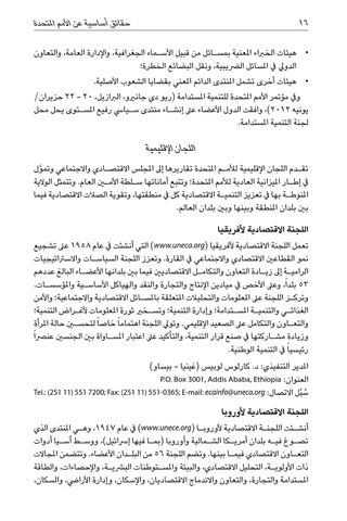 اللجان اإلقليمية تق�دم اللجان اإلقليمية لألم�م املتحدة تقاريرها إىل املجلس االقتص�ادي واالجتماعي وتم َّول يف إط�ار امليزانية العادية لألمم املتحدة؛ وتتبع أماناتها س�لطة األمين العام .وتتمثل الوالية املنوط�ة بها يف تعزيز التنمي�ة االقتصادية كل يف منطقتها ،وتقوية الصالت االقتصادية فيما بني بلدان املنطقة وبينها وبني بلدان العالم. اللجنة االقتصادية ألفريقيا تعمل اللجنة االقتصادية ألفريقيا ( )www.uneca.orgالتي أنشئت يف عام 1958عىل تشجيع نمو القطاعني االقتصادي واالجتماعي يف القارة .وتعزز اللجنة السياس�ات واالسرتاتيجيات الرامي�ة إىل زي�ادة التعاون والتكام�ل االقتصاديني فيما بني بلدانها األعض�اء البالغ عددهم 53بلداً ،وعىل األخص يف ميادين اإلنتاج والتجارة والنقد والهياكل األساس�ية واملؤسس�ات. وترك�ز اللجنة عىل املعلومات والتحليالت املتعلقة باملس�ائل االقتصادية واالجتماعية؛ واألمن الغذائ�ي والتنمي�ة املس�تدامة؛ وإدارة التنمية؛ وتس�خري ثورة املعلومات ألغ�راض التنمية؛ والتع�اون والتكامل عىل الصعيد اإلقليمي .وتويل اللجنة اهتماما ً خاصا ً لتحسين حالة املرأة وزيادة مش�اركتها يف صنع قرار التنمية ،والتأكيد عىل اعتبار املس�اواة بني الجنسني عنرصا ً رئيسيا ً يف التنمية الوطنية. املدير التنفيذي :د .كارلوس لوبيس (غينيا -بيساو) العنوانP.O. Box 3001, Addis Ababa, Ethiopia : س ُبل االتصالTel.: (251 11) 551 7200; Fax: (251 11) 551-0365; E-mail: ecainfo@uneca.org : ُ اللجنة االقتصادية ألوروبا أنش�ئت اللجن�ة االقتصادية ألوروب�ا ( )www.unece.orgيف عام ،1947وه�ي املنتدى الذي تص�وغ في�ه بلدان أمري�كا الش�مالية وأوروبا (بم�ا فيها إرسائيل) ،ووس�ط آس�يا أدوات التع�اون االقتصادي فيم�ا بينها .وتضم اللجنة 56من البل�دان األعضاء .وتتضمن املجاالت ذات األولوي�ة ،التحليل االقتصادي ،والبيئة واملس�توطنات البرشي�ة ،واإلحصاءات ،والطاقة املستدامة والتجارة ،والتعاون واالندماج االقتصاديان ،واإلسكان ،وإدارة األرايض ،والسكان،