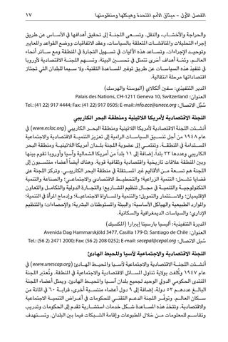 والحراجة واألخش�اب ،والنقل .وتس�عى اللجن�ة إىل تحقيق أهدافها يف األس�اس عن طريق إجراء التحليالت واملناقش�ات املتعلقة بالسياسات ،وعقد االتفاقيات ووضع القواعد واملعايري وتوحي�د اإلجراءات .وتس�اعد هذه اآلليات يف تس�هيل التجارة يف املنطقة ومع س�ائر أنحاء العال�م .وث ّم�ة أهداف أخرى تتمثل يف تحسين البيئة .وتس�هم اللجن�ة االقتصادية ألوروبا يف تنفيذ هذه السياس�ات عن طريق توفري املس�اعدة التقنية ،وال س�يما للبلدان التي تجتاز اقتصاداتها مرحلة انتقالية. املدير التنفيذي :سفني ألكاالي (البوسنة والهرسك) العنوانPalais des Nations, CH-1211 Geneva 10, Switzerland : س ُبل االتصالTel.: (41 22) 917 4444; Fax: (41 22) 917 0505; E-mail: info.ece@unece.org : ُ اللجنة االقتصادية ألمريكا الالتينية ومنطقة البحر الكاريبي أنش�ئت اللجنة االقتصادية ألمريكا الالتينية ومنطقة البح�ر الكاريبي ( )www.eclac.orgيف عام 1948من أجل تنس�يق السياس�ات الرامية إىل تعزيز التنمي�ة االقتصادية واالجتماعية املس�تدامة يف املنطق�ة .وتنتم�ي إىل عضوية اللجنة بل�دان أمريكا الالتيني�ة ومنطقة البحر الكاريبي وعددها 33بلداً ،إضافة إىل 11بلدا ً من أمريكا الشمالية وآسيا وأوروبا تقوم بينها وبني املنطقة عالقات تاريخية واقتصادية وثقافية قوية .وهناك أيضا ً أعضاء منتس�بون إىل اللجنة هم تس�عة م�ن األقاليم غري املس�تقلة يف منطقة البحر الكاريب�ي .وتركز اللجنة عىل قضايا تش�مل :التنمية الزراعية؛ والتخطي�ط االقتصادي واالجتماع�ي؛ والصناعة والتنمية التكنولوجي�ة والتنمي�ة يف مج�ال تنظيم املش�اريع؛ والتج�ارة الدولية والتكام�ل والتعاون اإلقليميان؛ واالس�تثمار والتمويل؛ والتنمية واملس�اواة االجتماعي�ة؛ وإدماج املرأة يف التنمية؛ واملوارد الطبيعية والهياكل األساسية؛ والبيئة واملستوطنات البرشية؛ واإلحصاءات؛ والتنظيم اإلداري؛ والسياسات الديمغرافية والسكانية. املديرة التنفيذية :أليسيا بارسينا إيربارا (املكسيك) العنوانAvenida Dag Hammarskjöld 3477, Casilla 179-D, Santiago de Chile : سبل االتصالTel.: (56 2) 2471 2000; Fax: (56 2) 208 0252; E-mail: secepal@cepal.org : ُ اللجنة االقتصادية واالجتماعية آلسيا واملحيط الهادئ أنش�ئت اللجن�ة االقتصادية واالجتماعية آلس�يا واملحي�ط اله�ادئ ( )www.unescap.orgيف عام ُ 1947 وكلفت بوالية تناول املس�ائل االقتصادية واالجتماعية يف املنطقة .و ُتعترب اللجنة املنتدى الحكومي الدويل الوحيد لجميع بلدان آس�يا واملحي�ط الهادئ .ويمثل أعضاء اللجنة البال�غ عدده�م 53دولة ،إضافة إىل 9دول أعضاء منتس�بة أخرى ،قراب�ة 60يف املائة من س�كان العال�م .وتو ّف�ر اللجنة الدع�م التقن�ي للحكومات يف أغ�راض التنمي�ة االجتماعية واالقتصادية .وتتخذ هذه املس�اعدة ش�كل خدمات استش�ارية تقدم إىل الحكومات وتدريب وتقاس�م للمعلومات م�ن خالل املطبوعات وإقامة الش�بكات فيما بني البلدان .وتس�تهدف