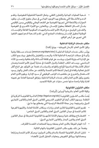 • •ش�عبة العمليات امليدانية والتعاون التقني ،وتمثل الشعبة التشغيلية للمفوضية ،وتقدم الدع�م لألنش�طة التي يضطلع به�ا الوجود امليدان�ي يف مجال حقوق اإلنس�ان ،وتقود الصعد الوطني واإلقليمي ودون اإلقليمي الحوارات واألنشطة التي تجريها املفوضية عىل ُ بش�أن املس�ائل املتعلقة بحقوق اإلنس�ان .وبالتعاون مع األجزاء األخ�رى يف املفوضية والتع�اون الوثي�ق م�ع رشكاء األمم املتح�دة والجه�ات الحكومية الفاعلة واملؤسس�ات الوطنية لحقوق اإلنس�ان ومنظمات املجتمع املدني ،تقدم الش�عبة الدعم لجهود التنفيذ التي تجري عىل أرض الواقع. مكتب خدمات الرقابة الداخلية وكيل األمني العام :كارمان البوينتيه -يونغ (كندا) يو ّف�ر مكتب خدمات الرقابة الداخلي�ة ( )www.un.org/depts/oiosخدمات مس�تقلة وفنية وآني�ة يف مجاالت املراجع�ة الداخلية لألداء والرص�د والتفتيش والتحقيق .ويش�جع املكتب عىل اإلدارة املس�ؤولة للموارد ويش�دد عىل قيام ثقافة امل ُ َس�اءَلة والش�فافية وتحسين األداء الربنامجي .ويس�اعد املكتب املنظمة والدول األعضاء يف حماية أصول األمم املتحدة وضمان امتثال األنش�طة الربنامجية للّوائح والقواعد والسياس�ات فضالً عن التوكيد عىل اتباع أكثر السبل فعالية وكفاءة يف إنجاز أنشطة األمم املتحدة؛ والكشف عن حاالت الغش والهدْر وسوء ُ االس�تعمال والخروج عن مقتضي�ات الواجب الوظيفي أو س�وء اإلدارة .ويقوم األمني العام بتعيني وكيل األمني العام ملكتب خدمات الرقابة الداخلية ،وتوافق الجمعية العامة عىل تعيينه لفرتة والية واحدة مدتها خمس سنوات غري قابلة للتجديد. مكتب الشؤون القانونية وكيلة األمني العام :باتريشيا أوبراين (آيرلندا) ُيع� ّد مكت�ب الش�ؤون القانوني�ة ( )http://legal.un.org/olaالدائ�رة القانوني�ة املركزية يف املنظمة .ويسهم املكتب أيضا ً يف التطوير التدريجي للقانون الدويل العام والقانون التجاري الدويل وتدوينهما .ومن جملة األنشطة الرئيسية التي يضطلع بها ما ييل: • •تقديم املشورة القانونية لألمني العام ،وإدارات ومكاتب األمانة العامة ،واألجهزة الفرعية لألمم املتحدة يف ميدان القانون الدويل العام والقانون الدويل الخاص؛ • •االضطلاع بوظائف فنية وبمهام األمانة لألجه�زة القانونية املنخرطة يف مجال القانون الدويل العام وقانون البحار والقانون التجاري الدويل؛ • •أداء املهام املنوطة باألمني العام بصفته وديعا ً للمعاهدات املتعددة األطراف. وفضالً عن ذلك ،يقوم مكتب الشؤون القانونية باملهام التالية: • •تناول املسائل القانونية املتصلة بالسالم واألمن الدوليني؛ وبمركز األمم املتحدة ومزاياها وحصاناتها؛ ووثائق التفويض وعمليات التمثيل للدول األعضاء؛