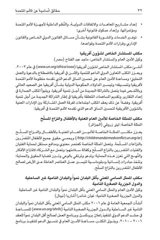 • •إعداد مش�اريع املعاه�دات واالتفاقات الدولي�ة ،وال ُنظم الداخلية ألجه�زة األمم املتحدة ومؤتمراتها ،وإعداد صكوك قانونية أخرى؛ • •توفير الخدمات واملش�ورة القانونية بش�أن مس�ائل القانون الدويل الخ�اص والقانون اإلداري وقرارات األمم املتحدة وقواعدها. مكتب املستشار الخاص لشؤون أفريقيا وكيل األمني العام واملستشار الخاص :ماجد عبد الفتاح (مرص) أنش�ئ مكتب املستشار الخاص لشؤون أفريقيا ( )www.un.org/africa/osaaيف عام .2003 ويع�زز املكتب التعاون الدويل الداعم للتنمية واألم�ن يف أفريقيا باالضطالع بالدعوة والعمل التحلييل؛ ومساعدة األمني العام عىل تحسني اتساق الدعم الذي تقدمه منظومة األمم املتحدة ألفريقيا وتنس�يقه؛ وتيسير املداوالت الحكومية الدولية بش�أن أفريقيا عىل الصعيد العاملي وباألخ�ص فيما يتصل بالرشاكة الجديدة من أج�ل تنمية أفريقيا .ويتبوأ املكتب الصدارة يف إعداد التقارير وتقديم املساهمات املتعلقة بأفريقيا يف إطار الرشاكة الجديدة من أجل تنمية أفريقيا .وفضالً عن ذلك يعقد املكتب اجتماعات لفرقة العمل املشتركة بني اإلدارات املعنية بالشؤون األفريقية لتحسني اتساق الدعم الذي تقدمه األمم املتحدة يف أفريقيا. مكتب املمثلة الخاصة لألمني العام املعنية باألطفال والنزاع املسلّح املمثلة الخاصة :ليىل زروقي (الجزائر)