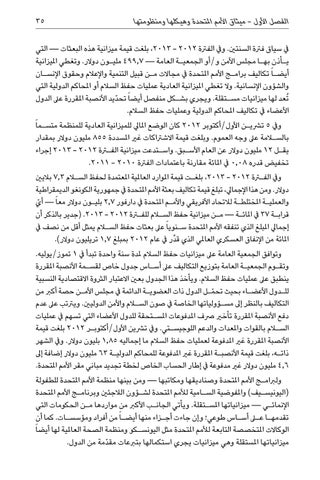 يف سياق فرتة السنتني .ويف الفرتة ،2013 - 2012بلغت قيمة ميزانية هذه البعثات — التي ي�أذن به�ا مجلس األمن و/أو الجمعي�ة العامة — 499,7ملي�ون دوالر .وتغطي امليزانية أيض�ا ً تكاليف برام�ج األمم املتحدة يف مجاالت م�ن قبيل التنمية واإلعالم وحقوق اإلنس�ان والشؤون اإلنسانية .وال تغطي امليزانية العادية عمليات حفظ السالم أو املحاكم الدولية التي ُتعد لها ميزانيات مس�تقلة .ويجري بش�كل منفصل أيضا ً تحدّيد األنصبة املقررة عىل الدول األعضاء يف تكاليف املحاكم الدولية وعمليات حفظ السالم.