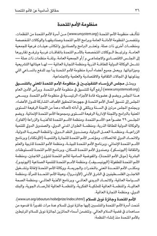 منظومة األمم املتحدة تتأل�ف منظومة األمم املتحدة ( )www.unsystem.orgم�ن أرسة األمم املتحدة من املنظمات. وتتضم�ن املنظومة األمان�ة العامة وبرامج األمم املتحدة وصناديقه�ا والوكاالت املتخصصة ومنظم�ات أخرى ذات صلة .وتعتبر الربامج والصناديق واملكاتب هيئ�ات فرعية للجمعية العام�ة .وترتب�ط ال�وكاالت املتخصصة باألم�م املتحدة باتفاق�ات فردية وترف�ع تقاريرها إىل املجل�س االقتص�ادي واالجتماع�ي و/أو الجمعية العامة .وث ّم�ة منظمات ذات صلة — تش�مل الوكالة الدولية للطاق�ة الذرية ومنظمة التجارة العاملية — له�ا هيئاتها الترشيعية وميزانياتها .ويعمل جميع أعضاء أرسة منظومة األمم املتحدة يدا ً بيد للدفع باملس�اعي التي يبذلونها يف املجاالت الثقافية واالقتصادية والعلمية واالجتماعية. ويمث�ل مجلس الرؤس�اء التنفيذيين يف منظومة األمم املتحدة املعني بالتنس�يق ( )www.unsystemceb.orgأرفع آلية للتنسيق يف منظومة األمم املتحدة .ويرأس األمني العام ه�ذا املجلس ويضم يف عضويته قادة األجزاء الرئيس�ية يف منظومة األمم املتحدة .ويس�عى املجلس إىل تنسيق أعمال األمم املتحدة يف جهودها لتحقيق األهداف املشرتكة للدول األعضاء. ويجتمع املجلس مرتني يف الس�نة ويتلقى يف أدائه ألعماله دعما ً من اللجنة الرفيعة املستوى املعنية بالربامج واللجنة اإلدارية الرفيعة املس�توى ومجموعة األمم املتحدة اإلنمائية .ويضم املجل�س 29عض�وا ً هم :األم�م املتحدة ،ومنظمة األم�م املتحدة لألغذي�ة والزراعة (الفاو)، والوكالة الدولية للطاقة الذرية ،ومنظم�ة الطريان املدني الدويل ،والصندوق الدويل للتنمية الزراعي�ة ،ومنظم�ة العم�ل الدولية ،وصن�دوق النقد ال�دويل ،واملنظمة البحري�ة الدولية، واالتح�اد الدويل لالتصاالت ،ومؤتم�ر األمم املتحدة للتجارة والتنمي�ة (األونكتاد) وبرنامج األم�م املتحدة اإلنمائي ،وبرنامج األمم املتحدة للبيئ�ة ،ومنظمة األمم املتحدة للرتبية والعلم والثقافة (اليونسكو) ،وصندوق األمم املتحدة للسكان ،وبرنامج األمم املتحدة للمستوطنات البرشية (موئل األمم املتحدة) ،واملفوضية السامية لألمم املتحدة لشؤون الالجئني ،ومنظمة األمم املتحدة للطفولة (اليونيس�يف) ،ومنظمة األم�م املتحدة للتنمية الصناعية (اليونيدو)، ومكت�ب األمم املتح�دة املعني باملخدرات والجريم�ة ،ووكالة األمم املتحدة إلغاثة وتش�غيل الالجئين الفلس�طينيني يف الرشق األدنى (األون�روا) ،وهيئة األمم املتح�دة للمرأة ،ومنظمة الس�ياحة العاملية ،واالتح�اد الربيدي العامل�ي ،وبرنامج األغذية العامل�ي ،ومنظمة الصحة العاملي�ة ،واملنظم�ة العاملية للملكي�ة الفكرية ،واملنظم�ة العاملية لألرص�اد الجوية ،والبنك الدويل ،ومنظمة التجارة العاملية. األمم املتحدة وجائزة نوبل للسالم (.)www.un.org/aboutun/nobelprize/index.shtml ُمنحت أرسة األمم املتحدة واملنتسبني إليها جائزة نوبل للسالم عدة مرات تقديرا ً ملا قدموه من مساهمات يف قضية السالم العاملي .وتتضمن أسماء الحائزين لجائزة نوبل للسالم املرتبطني باألمم املتحدة منذ إنشاء املنظمة: