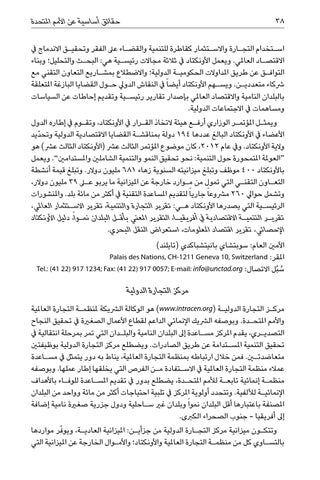 مركز التجارة الدولية مرك�ز التجارة الدولي�ة ( )www.intracen.orgهو الوكالة الرشيكة ملنظم�ة التجارة العاملية واألمم املتح�دة .وبوصفه الرشيك اإلنمائي الداعم لقطاع األعمال الصغرية يف تحقيق النجاح التصدي�ري ،يقدم املركز مس�اعدة إىل البلدان النامية والبل�دان التي تمر بمرحلة انتقالية يف تحقيق التنمية املس�تدامة عن طريق الصادرات .ويضطلع مركز التجارة الدولية بوظيفتني متعاضدتين .فمن خالل ارتباطه بمنظمة التجارة العاملية ،يناط به دور يتمثل يف مس�اعدة عمالء منظمة التجارة العاملية يف االس�تفادة م�ن الفرص التي يخلقها إطار عملها .وبوصفه منظم�ة إنمائية تابع�ة لألمم املتح�دة ،يضطلع بدور يف تقديم املس�اعدة للوف�اء باألهداف اإلنمائي�ة لأللفية .وتتحدد أولوية املركز يف تلبية احتياجات أكثر من مائة وواحد من البلدان املصنفة باعتبارها أقل البلدان نموا ً وبلدان غري س�احلية ودول جزرية صغرية نامية إضافة إىل أفريقيا -جنوب الصحراء الكربى. وتتك�ون ميزانية مركز التج�ارة الدولية من جزأي�ن :امليزانية العادي�ة ،ويو ّفر مواردها بالتس�اوي كل من منظم�ة التجارة العاملية واألونكتاد؛ واألم�وال الخارجة عن امليزانية التي