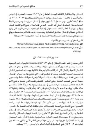 الع�ادل .ونتيجة لقرار اتخذته الجمعية العامة يف عام ،2012أصبحت العضوية يف املجلس حالي�ا ً عضوية عاملي�ة .ويصل إجمايل ميزانية الربنامج املعتم�دة للفرتة 2013 - 2012إىل مبلغ 618,6مليون دوالر تش�مل 143مليون دوالر يف ش�كل تمويل مقدم من مرفق البيئة العاملية .ويمثل الصندوق البيئي آلية التمويل الطوعي األساسية لربنامج األمم املتحدة للبيئة. وتو ّف�ر امليزاني�ة العادية لألمم املتحدة موارد إضافية للربنامج علاوة عىل املوارد التي يقوم الربنامج بتعبئتها يف شكل صناديق استئمانية ومساهمات ُترصد ألغراض مخصصة .ويبلغ عدد موظفي برنامج األمم املتحدة للبيئة املنترشين يف أنحاء العالم زهاء 850موظفاً. املدير التنفيذي :أتشيم ستانري (أملانيا) املقرUnited Nations Avenue, Gigiri, P.O. Box 30552, 00100, Nairobi, Kenya : س ُبل االتصالTel.: (254 20) 762 1234; Fax: (254 20) 762 4489, 4490; E-mail: unepinfo@ : ُ unep.org