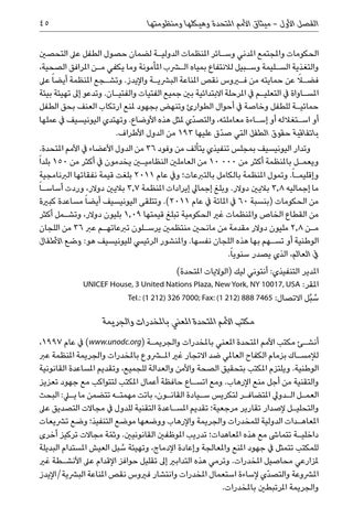 مكتب األمم املتحدة املعني باملخدرات والجريمة أنش�ئ مكتب األمم املتحدة املعني باملخدرات والجريم�ة ( )www.unodc.orgيف عام ،1997 لإلمس�اك بزمام الكفاح العاملي ضد االتجار غري املشروع باملخدرات والجريمة املنظمة عرب الوطنية .ويلتزم املكتب بتحقيق الصحة واألمن والعدالة للجميع ،وتقديم املساعدة القانونية والتقنية من أجل منع اإلرهاب .ومع اتس�اع حافظة أعمال املكتب لتتواكب مع جهود تعزيز العم�ل ال�دويل املتضاف�ر لتكريس س�يادة القان�ون ،باتت مهمت�ه تتضمن ما يلي :البحث والتحلي�ل إلصدار تقارير مرجعية؛ تقديم املس�اعدة التقنية للدول يف مجاالت التصديق عىل املعاه�دات الدولية للمخدرات والجريمة واإلرهاب ووضعها موضع التنفيذ؛ وضع ترشيعات داخلي�ة تتماىش مع هذه املعاهدات؛ تدريب املوظفني القانونيني .وث ّمة مجاالت تركيز أخرى للمكتب تتمثل يف جهود املنع واملعالجة وإعادة اإلدماج ،وتهيئة ُسبل العيش املستدام البديلة ملزارعي محاصيل املخدرات .وترمي هذه التدابري إىل تقليل حوافز اإلقدام عىل األنش�طة غري املرشوعة والتصدّي إلساءة استعمال املخدرات وانتشار فريوس نقص املناعة البرشية/اإليدز والجريمة املرتبطني باملخدرات.