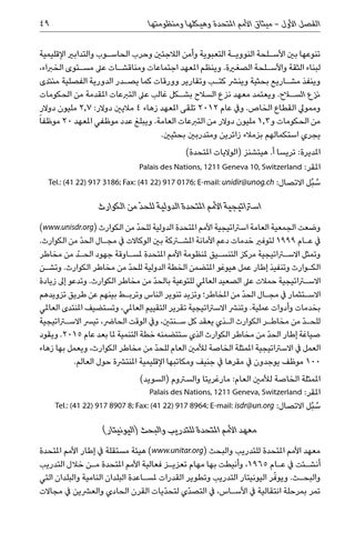 تنوعها بني األس�لحة النووي�ة التعبوية وأمن الالجئني وحرب الحاس�وب والتدابري اإلقليمية لبناء الثقة واألس�لحة الصغرية .وينظم املعهد اجتماعات ومناقش�ات عىل مس�توى الخرباء، وينفذ مش�اريع بحثية وينرش كت�ب وتقارير وورقات كما يص�در الدورية الفصلية منتدى نزع السلاح .ويعتمد معهد نزع السالح بش�كل غالب عىل التربعات املقدمة من الحكومات وممويل القطاع الخاص .ويف عام 2012تلقى املعهد زهاء 4ماليني دوالر 2,7 :مليون دوالر من الحكومات و 1,3مليون دوالر من التربعات العامة .ويبلغ عدد موظفي املعهد 20موظفا ً يجري استكمالهم بزمالء زائرين ومتدربني بحثيني. املديرة :تريسا أ .هيتشنز (الواليات املتحدة) املقرPalais des Nations, 1211 Geneva 10, Switzerland : س ُبل االتصالTel.: (41 22) 917 3186; Fax: (41 22) 917 0176; E-mail: unidir@unog.ch : ُ