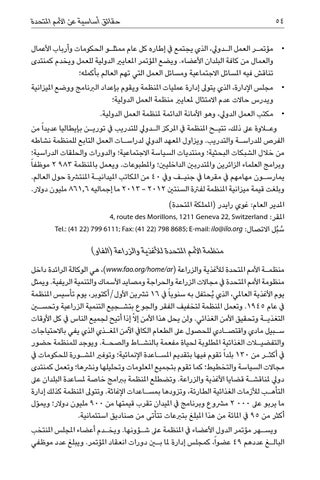 منظمة األمم املتحدة لألغذية والزراعة (الفاو) منظم�ة األمم املتحدة لألغذية والزراعة ( ،)www.fao.org/home/arهي الوكالة الرائدة داخل منظومة األمم املتحدة يف مجاالت الزراعة والحراجة ومصايد األسماك والتنمية الريفية .ويمثل يوم األغذية العاملي ،الذي ُيحتفل به سنويا ً يف 16ترشين األول/أكتوبر ،يوم تأسيس املنظمة يف عام .1945وتعمل املنظمة لتخفيف الفقر والجوع بتش�جيع التنمية الزراعية وتحسين التغذي�ة وتحقيق األمن الغذائي .ولن يحل هذا األمن إالّ إذا أتيح لجميع الناس يف كل األوقات س�بيل مادي واقتص�ادي للحصول عىل الطعام الكايف اآلمن املغ�ذي الذي يفي باالحتياجات والتفضيلات الغذائية املطلوبة لحياة مفعمة بالنش�اط والصح�ة .ويوجد للمنظمة حضور يف أكث�ر من 130بلدا ً تقوم فيها بتقديم املس�اعدة اإلنمائية؛ وتوفري املش�ورة للحكومات يف مجاالت السياسة والتخطيط؛ كما تقوم بتجميع املعلومات وتحليلها ونرشها؛ وتعمل كمنتدى دويل ملناقش�ة قضايا األغذية والزراعة .وتضطلع املنظمة بربامج خاصة ملساعدة البلدان عىل التأه�ب لألزمات الغذائية الطارئة ،وتزودها بمس�اعدات اإلغاثة .وتتوىل املنظمة كذلك إدارة ما يربو عىل 2 000مرشوع وبرنامج يف امليدان تقرب قيمتها من 900مليون دوالر؛ ويم ّول أكثر من 95يف املائة من هذا املبلغ بتربعات تتأتى من صناديق استئمانية. ويس�هر مؤتمر الدول األعضاء يف املنظمة عىل ش�ؤونها .ويخ�دم أعضاء املجلس املنتخب البال�غ عددهم 49عضواً ،كمجلس إدارة ملا بين دورات انعقاد املؤتمر .ويبلغ عدد موظفي