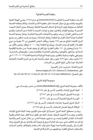 منظمة الصحة العاملية أنش�ئت منظمة الصح�ة العاملي�ة ( )www.who.int/arيف ع�ام ،1948وه�ي الهيئة املعنية بالتوجيه والتنس�يق يف مجال الصحة داخل منظومة األم�م املتحدة .وتناط بمنظمة الصحة العاملية مس�ؤولية توفري الريادة يف املسائل الصحية العاملية؛ وصياغة جدول أعمال البحوث الصحي�ة؛ ووضع القواعد واملعايري؛ وطرح خيارات للسياس�ة قائمة على الرباهني؛ وتقديم الدع�م التقني للبلدان؛ ورصد وتقيي�م االتجاهات الصحية العاملي�ة .وتمثل جمعية الصحة العاملي�ة هيئ�ة اتخاذ القرار يف املنظمة ،وتعقد اجتماعا ً س�نويا ً يحضره ممثلون من جميع الدول األعضاء البالغ عددهم 194عضواً .ويتألف املجلس التنفيذي من 34عضوا ً من ذوي املؤهلات الفنية يف ميدان الصحة .ويعمل يف املنظمة زهاء 8 000موظف ينتمون ألكثر من 150بل�دا ً ويعملون يف 150مكتب�ا ً قطرياً ،ويف املقر يف جنيف فضالً ع�ن مقارها اإلقليمية الستة يف :برازافيل بالكونغو؛ وواشنطن العاصمة؛ والقاهرة بمرص؛ وكوبنهاغن بالدانمرك؛ ونيودلهي بالهند؛ ومانيال بالفلبني .وتزيد قيمة امليزانية الربنامجية للفرتة 2013 - 2012عىل 3,9باليني دوالر ،منها 949مليون دوالر تم ّول بأنصبة مقررة عىل الدول األعضاء (امليزانية العادية) ،فيما يتأتى املبلغ املتبقي من التربعات. املديرة العامة :مارغريت شان (الصني) املقرAvenue Appia 20, 1211 Geneva 27, Switzerland : س ُبل االتصالTel.: (41 22) 791 21 11; Fax: (41 22) 791 31 11; E-mail: inf@who.int : ُ