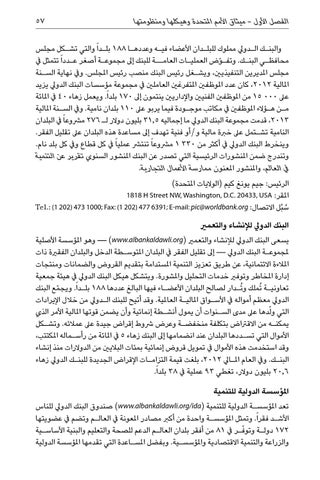 والبن�ك ال�دويل مملوك للبل�دان األعضاء في�ه وعدده�ا 188بلـدا ً والتي تش�كل مجلس محافظ�ي البن�ك .وتف� ّوض العملي�ات العامـ�ة للبنك إىل مجموع�ة أصغر ع�ددا ً تتمثل يف مجلس املديرين التنفيذيني ،ويش�غل رئيس البنك منصب رئيس املجلس .ويف نهاية الس�نة املالية ،2012كان عدد املوظفني املتفرغني العاملني يف مجموعة مؤسسات البنك الدويل يزيد عىل 15 000من املوظفني الفنيني واإلداريني ينتمون إىل 170بلداً .ويعمل زهاء 40يف املائة م�ن ه�ؤالء املوظفني يف مكاتب موج�ودة فيما يربو عىل 110بلدان نامية .ويف الس�نة املالية ،2013قدمت مجموعة البنك الدويل ما إجماليه 31,5بليون دوالر لـ 276مرشوعا ً يف البلدان النامية تش�تمل عىل خربة مالية و/أو فنية تهدف إىل مساعدة هذه البلدان عىل تقليل الفقر. وينخرط البنك الدويل يف أكثر من 1 330مرشوعا ً تنترش عمليا ً يف كل قطاع ويف كل بلد نام. وتندرج ضمن املنشورات الرئيسية التي تصدر عن البنك املنشور السنوي تقرير عن التنمية يف العالم ،واملنشور املعنون ممارسة األعمال التجارية. الرئيس :جيم يونغ كيم (الواليات املتحدة) املقر1818 H Street NW, Washington, D.C. 20433, USA : ُس ُبل االتصالTel.: (1 202) 473 1000; Fax: (1 202) 477 6391; E-mail: pic@worldbank.org : البنك الدويل لإلنشاء والتعمري يسعى البنك الدويل لإلنشاء والتعمري ( — )www.albankaldawli.orgوهو املؤسسة األصلية ملجموع�ة البنك الدويل — إىل تقليل الفقر يف البلدان املتوس�طة الدخل والبلدان الفقرية ذات املالءة االئتمانية ،عن طريق تعزيز التنمية املستدامة بتقديم القروض والضمانات ومنتجات إدارة املخاطر وتوفري خدمات التحليل واملشورة .ويتشكل هيكل البنك الدويل يف هيئة جمعية تعاوني�ة ُتملك و ُت�دار لصالح البلدان األعض�اء فيها البالغ عددها 188بل�داً .ويج ّمع البنك الدويل معظم أمواله يف األس�واق املالي�ة العاملية .وقد أتيح للبنك ال�دويل من خالل اإليرادات التي ولّدها عىل مدى الس�نوات أن يمول أنش�طة إنمائية وأن يضمن قوتها املالية األمر الذي يمكن�ه من االقرتاض بتكلفة منخفض�ة وعرض رشوط إقراض جيدة عىل عمالئه .وتش�كل األموال التي تس�ددها البلدان عند انضمامها إىل البنك زهاء 5يف املائة من رأس�ماله املكتتب، وقد استخدمت هذه األموال يف تمويل قروض إنمائية بمئات الباليني من الدوالرات منذ إنشاء البن�ك .ويف العام امل�ايل ،2012بلغت قيمة التزام�ات اإلقراض الجديدة للبن�ك الدويل زهاء 20,6بليون دوالر ،تغطي 93عملية يف 38بلداً. املؤسسة الدولية للتنمية تعد املؤسس�ة الدولية للتنمية ( )www.albankaldawli.org/idaصندوق البنك الدويل للناس األش�د فقراً .وتمثل املؤسس�ة واحدة من أكرب مصادر املعونة يف العال�م وتضم يف عضويتها 172دول�ة وتو ّف�ر يف 81من أفقر بلدان العال�م الدعم للصحة والتعليم والبنية األساس�ية والزراعة والتنمية االقتصادية واملؤسس�ية .وبفضل املس�اعدة التي تقدمها املؤسسة الدولية