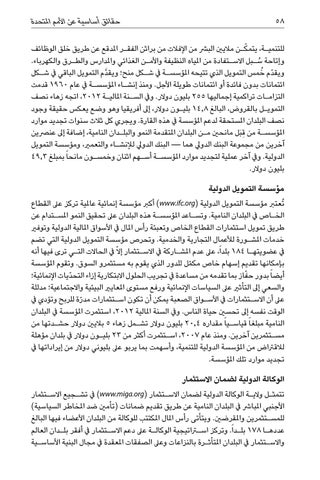 ّ يتمك�ن ماليني البرش من اإلفالت من براثن الفق�ر املدقع عن طريق خلق الوظائف للتنمي�ة، وإتاحة ُس�بل االس�تفادة من املياه النظيفة واألم�ن الغذائي واملدارس والط�رق والكهرباء. ويقدّم ُخمس التمويل الذي تتيحه املؤسس�ة يف ش�كل منح؛ ويقدَّم التمويل الباقي يف ش�كل ائتمانات بدون فائدة أو ائتمانات طويلة األجل .ومنذ إنش�اء املؤسس�ة يف عام 1960قدمت التزام�ات تراكمية إجماليها 255بليون دوالر .ويف الس�نة املالي�ة ،2012اتجه زهاء نصف التموي�ل بالقروض ،البالغ 14,8بلي�ون دوالر ،إىل أفريقيا وهو وضع يعكس حقيقة وجود نصف البلدان املستحقة لدعم املؤسسة يف هذه القارة .ويجري كل ثالث سنوات تجديد موارد املؤسس�ة من ِقبَل مانحني م�ن البلدان املتقدمة النمو والبل�دان النامية ،إضافة إىل عنرصين آخرين من مجموعة البنك الدويل هما — البنك الدويل لإلنش�اء والتعمري ،ومؤسسة التمويل الدولية .ويف آخر عملية لتجديد موارد املؤسس�ة أس�هم اثنان وخمس�ون مانحا ً بمبلغ 49,3 بليون دوالر. مؤسسة التمويل الدولية ُتعترب مؤسسة التمويل الدولية ( )www.ifc.orgأكرب مؤسسة إنمائية عاملية تركز عىل القطاع الخ�اص يف البلدان النامية .وتس�اعد املؤسس�ة هذه البلدان عىل تحقيق النمو املس�تدام عن طريق تمويل استثمارات القطاع الخاص وتعبئة رأس املال يف األسواق املالية الدولية وتوفري خدمات املش�ورة لألعمال التجارية والخدمية .وتحرص مؤسسة التمويل الدولية التي تضم يف عضويته�ا 184بلداً ،عىل عدم املش�اركة يف االس�تثمار إالّ يف الحاالت الت�ي ترى فيها أنه بإمكانها تقديم إسهام خاص مك ّمل للدور الذي يقوم به مستثمرو السوق .وتقوم املؤسسة أيضا ً بدور ح ّفاز بما تقدمه من مساعدة يف تجريب الحلول االبتكارية إزاء التحدّيات اإلنمائية؛ والسعي إىل التأثري عىل السياسات اإلنمائية ورفع مستوى املعايري البيئية واالجتماعية؛ مدللة عىل أن االس�تثمارات يف األس�واق الصعبة يمكن أن تكون اس�تثمارات مد ّرة للربح وتؤدي يف الوقت نفسه إىل تحسني حياة الناس .ويف السنة املالية ،2012استثمرت املؤسسة يف البلدان النامية مبلغا ً قياس�يا ً مقداره 20,4بليون دوالر تش�مل زهاء 5باليني دوالر حش�دتها من مس�تثمرين آخرين .ومنذ عام ،2007اس�تثمرت أكثر من 23بلي�ون دوالر يف بلدان مؤهلة لالقرتاض من املؤسسة الدولية للتنمية ،وأسهمت بما يربو عىل بليوني دوالر من إيراداتها يف تجديد موارد تلك املؤسسة. الوكالة الدولية لضمان االستثمار تتمث�ل والي�ة الوكالة الدولية لضمان االس�تثمار ( )www.miga.orgيف تش�جيع االس�تثمار األجنبي املبارش يف البلدان النامية عن طريق تقديم ضمانات (تأمني ضد املخاطر السياسية) للمس�تثمرين واملقرضني .ويتأتى رأس املال املكتتب للوكالة من البلدان األعضاء فيها البالغ عدده�ا 178بل�داً .وتركز استراتيجية الوكال�ة عىل دعم االس�تثمار يف أفقر بل�دان العالم واالس�تثمار يف البلدان املتأث�رة بالنزاعات وعىل الصفقات املعقدة يف مجال البنية األساس�ية