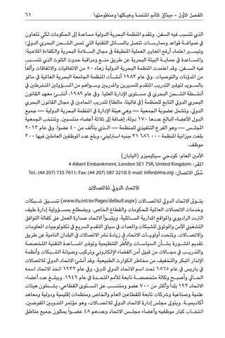 الذي تتسبب فيه السفن .وتقدم املنظمة البحرية الدولية مساعدة إىل الحكومات لكي تتعاون يف صياغ�ة قواعد وممارس�ات تتصل باملس�ائل التقنية التي تمس الش�حن البحري الدويل؛ وتيسير اعتماد أرفع املعايري العملية املنطبقة يف مجال السلامة البحرية والكفاءة املالحية؛ واملس�اعدة يف حماي�ة البيئة البحرية عن طريق من�ع ومراقبة حدوث التلوث الذي تتس�بب فيه الس�فن .وقد اعتمدت املنظمة البحرية الدولية زهاء 50من االتفاقيات واالتفاقات وألفا ً من املد ّونات والتوصيات .ويف عام 1983أنش�أت املنظمة الجامعة البحرية العاملية يف ماملو بالس�ويد لتوفري التدريب املتقدم للمديرين واملدربني وس�واهم من املس�ؤولني املنخرطني يف أنش�طة الش�حن البحري يف مس�توى اإلدارة العليا .ويف عام ،1989أنش�ئ معهد القانون البحري الدويل التابع للمنظمة (يف فاليتا ،مالطا) لتدريب املحامني يف مجال القانون البحري الدويل .وتشمل عضوية الجمعية — وهي هيئة اإلدارة يف املنظمة البحرية الدولية — جميع الدول األعضاء البالغ عددها 170دولة ،إضافة إىل ثالثة أعضاء منتسبني .وتنتخب الجمعية املجل�س — وهو الفرع التنفيذي للمنظمة — ال�ذي يتألف من 40عضواً .ويف عام 2013 بلغت ميزانية املنظمة 31 686 000جنيه اسرتليني ،وبلغ عدد املوظفني العاملني فيها 300 موظف. األمني العام :كودجي سيكيميزو (اليابان) املقر4 Albert Embankment, London SE1 7SR, United Kingdom : س ُبل االتصالTel.: (44 207) 735 7611; Fax: (44 207) 587 3210; E-mail: infor@imo.org : ُ