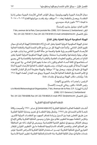 مجال األرصاد الجوية والهيدرولوجية .ويمثل املؤتمر العاملي لألرصاد الجوية مجلس إدارة املنظم�ة .ويعم�ل باملنظمة زهاء 300موظف ،وقد بلغ�ت ميزانيتها للفرتة 2015 - 2012 ما قيمته 276مليون فرنك سويرسي. األمني العام :ميشيل جارود (فرنسا) املقر7 bis, avenue de la Paix, Case postale No. 2300, 1211 Geneva 2, Switzerland : س ُبل االتصالTel.: (41 22) 730 8111; Fax: (41 22) 730 8181; E-mail: wmo@wmo.int : ُ الهيئة الحكومية الدولية املعنية بتغيرّ املناخ تمث�ل الهيئة الحكومية الدولية املعنية بتغيرّ املن�اخ ( )www.ipcc.chالهيئة الرائدة يف مجال تقييم التغيرّ املناخي .وأنشأ هذه الهيئة كل من برنامج األمم املتحدة للبيئة واملنظمة العاملية لألرص�اد الجوية لتقدي�م رؤية علمية واضحة عن حالة التغيرّ املناخي وما يرتتب عليه من عواقب بيئية واجتماعية واقتصادي�ة محتملة .وتتوىل الهيئة الحكومية الدولية املعنية بتغري املناخ اس�تعراض وتقييم املعلومات العلمية والتقني�ة واالجتماعية واالقتصادية التي يجري اس�تخالصها يف كافة أنح�اء العالم وتكون ذات صل�ة بفهم املناخ العامل�ي .وال تجري هذه الهيئ�ة أبحاثا ً أو تقوم برصد البيانات .وتس�تضيف املنظم�ة العاملية لألرصاد الجوية أمانة الهيئة يف مقرها يف جنيف ،ويعمل بها 12موظفاً .والهيئة مفتوحة أمام كل البلدان األعضاء يف األمم املتحدة ويف املنظمة العاملية لألرصاد الجوية؛ ويبلغ عدد البلدان أعضاء الهيئة 195 بلداً .و ُينتخب مكتب الهيئة ورئيسها يف جلسات عامة. الرئيس :راجندرا ك .باتشوري (الهند) رئيس األمانة :دكتور ريناتي كريست (النمسا) أمان�ة الهيئ�ةc/o World Meteorological Organization, 7 bis, Avenue de la Paix, C.P. : 2300, 1211 Geneva 2, Switzerland