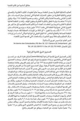 الصندوق الدويل للتنمية الزراعية ُيك ّرس الصندوق الدويل للتنمية الزراعية ( )www.ifad.orgلتمكني فقراء الريف من تحسين أمنهم الغذائي والتغذوي ،وزيادة دخولهم وتدعيم قدرتهم عىل التح ّمل .ويحش�د الصندوق امل�وارد من بلدانه األعضاء البالغ عددها 172بلدا ً من أجل توفري القروض بفائدة منخفضة أو تقدي�م املنح لتمويل التنمية الريفية .ويو ّفر الصن�دوق املنح بدال ً من القروض يف البلدان الفقرية غري القادرة عىل تحمل عبء الديون لكي يضمن أالّ تتسبب املساعدة املالية األساسية يف مشقة مالية ال داعي لها ألش ّد الناس احتياجاً .ويعمل الصندوق يف رشاكات مع الحكومات وال�وكاالت األخ�رى يف األمم املتحدة وال�وكاالت الثنائية واملتعددة األط�راف واملراكز الدولية للبحوث الزراعية والقط�اع الخاص .ويقيم أيضا ً عالقات متينة مع منظمات املجتمع املدني وال س�يما منظمات املزارعني أصح�اب الحيازات الصغرية ومنظم�ات الريفيني ،وكذلك مع املنظمات غري الحكومية ومعاهد بحوث السياسات والجامعات .و ُيم َّول الصندوق بالتربعات التي تقدمها الحكومات وبمس�اهمات خاصة وبمدفوعات الديون وإيرادات االس�تثمار .وقد اس�تثمر الصندوق منذ نش�أته وحت�ى نهاية عام 2012ما مجموع�ه 14,8بليون دوالر يف مس�ت بنتائجها قرابة 400مليون نس�مة من فقراء الريف يف زهاء 924مرشوعا ً وبرنامجا ً ّ العالم .وأسهمت الحكومات ومصادر التمويل األخرى يف البلدان املستفيدة ،بما فيها األطراف املش�اركة يف املش�اريع ،بمبلغ 12,3بليون دوالر ،فيما جاء زه�اء 9,6باليني دوالر كتمويل مشترك مقدم من جهات مانحة متعددة األطراف وثنائية ومانحني آخرين .ويتألف مجلس إدارة الصن�دوق من جميع الدول األعضاء .أما املجلس التنفيذي ،الذي يتكون من 18عضوا ً و 18عضوا ً مناوباً ،فيرشف عىل العمليات ويوافق عىل القروض واملنح.
