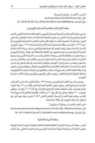 منظمة األمم املتحدة للتنمية الصناعية (اليونيدو) تشجع منظمة األمم املتحدة للتنمية الصناعية (اليونيدو) ( )www.unido.orgالتكوين العادل للثروة وتحقي�ق الرخاء العاملي عن طريق التنمية الصناعية املس�تدامة والتعاون الصناعي الدويل .وقد أنش�أت الجمعية العام�ة منظمة األمم املتحدة للتنمي�ة الصناعية (اليونيدو) يف ع�ام ،1966وأصبحت وكالة متخصصة تابعة لألمم املتحدة يف عام .1985وتزود اليونيدو البل�دان النامي�ة بحلول وافي�ة تهدف إىل تنمية قط�اع إنتاجي مزدهر وزيادة املش�اركة يف التجارة الدولية وتحسني ُسبل الحصول عىل الطاقة واملحافظة عىل البيئة .وتشرتك اليونيدو م�ع الحكوم�ات والقطاع الخاص ورابطات األعمال وأصح�اب املصلحة اآلخرين يف مجابهة وس�بل التحدّي�ات املعق�دة يف مجال التنمي�ة الصناعية بما يع�ود بالفائدة عىل حياة البرش ُ معاشهم .ويتضمن مجموع موارد اليونيدو موظفني متخصصني يف فيينا يعملون يف ميادين الهندسة والسياسات الصناعية واالقتصادية والتكنولوجيا والبيئة ،وموظفني فنيني يعملون يف ش�بكة املنظمة ملكاتب تش�جيع االس�تثمار والتكنولوجيا ،واملراكز الدولي�ة للتكنولوجيا، واملراكز الوطنية لإلنتاج النظيف .ويتوىل ممثلون إقليميون و ُقطريون قيادة املكاتب امليدانية لليونيدو. وتجتم�ع ال�دول األعضاء يف اليوني�دو وعددها 172دولة يف املؤتمر الع�ام من أجل إقرار امليزاني�ة وبرنامج العمل .ويتوىل مجلس التنمية الصناعية الذي يتألف من 53دولة عضواً، تقديم توصيات بشأن تخطيط وتنفيذ الربنامج وامليزانية .ويف عام ،2012بلغ عدد موظفي اليونيدو 700موظف يعملون يف املقر ويف 30من املكاتب اإلقليمية والقطرية يف جميع أنحاء العال�م .وبلغت قيمة اإلنج�از يف مجال التعاون التقني 189,2ملي�ون دوالر وهو أعىل رقم يتحقق منذ تح ّول اليونيدو إىل وكالة متخصصة. املدير العام :كانديه ك .بومكيال (سرياليون) املقرVienna International Centre, Wagramerstrasse 5, P.O. Box 300, 1400 Vienna, Austria : س ُبل االتصالTel.: (43 1) 26026 0; Fax: (43 1) 269 2669; E-mail: unido@unido.org : ُ