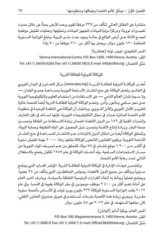 الوكالة الدولية للطاقة الذرية ُتعتبر الوكال�ة الدولية للطاق�ة الذري�ة ( )www.iaea.orgمركز التع�اون يف امليدان النووي يف العال�م ،وتعمل الوكالة عىل منع انتش�ار األس�لحة النووية ومس�اعدة جمي�ع البلدان — وال س�يما بلدان العالم النامي — عىل االس�تفادة من استخدام العلوم والتكنولوجيا النووية على نحو س�لمي ومأمون وآمن .وتخدم الوكالة الدولية للطاق�ة الذرية أيضا ً كمنصة عاملية لتعزي�ز األمان النووي واألمن الن�ووي .وباعتبار أن الوكالة هي املنظمة الوحيدة يف منظومة األمم املتحدة الحائزة خربات يف مجال التكنولوجيات النووية ،فإنها تس�اعد يف نقل املعارف والخربات الفنية إىل 159من الدول األعضاء لضمان زيادة االس�تفادة من الطاقة وتحسين صحة البرش وزيادة إنتاج األغذية وتحسني ُسبل الحصول عىل املياه النظيفة وحماية البيئة. وتتحقق الوكالة أيضا ً من امتثال الدول اللتزامات عدم االنتش�ار للمس�اعدة يف منع انتش�ار األسلحة النووية .ويقوم املفتشون التابعون للوكالة بتنفيذ زهاء 2 000مهمة تفتيش سنويا ً يف أكث�ر م�ن 1 200موقع تنتشر يف 78دولة ،للتحقق من عدم تحري�ف املواد النووية عن مس�ار االستخدامات الس�لمية .وقد أنش�ئت الوكالة يف عام 1957ككيان يتمتع باالستقالل الذاتي تحت رعاية األمم املتحدة. وتتضم�ن هيئ�ات اإلدارة يف الوكالة الدولية للطاق�ة الذرية ،املؤتمر الع�ام ،الذي يجتمع س�نويا ً ويتألف من جميع الدول األعضاء ،ومجلس املحافظين ،الذي يتألف من 35عضواً، ويجتمع فصليا ً ويناط به اتخاذ القرارات الرئيسية املتعلقة بالسياسة .ويرشف املدير العام عىل أمانة تضم أكثر من 2 400موظف موجودين يف مقر الوكالة بفيينا يف النمسا .ويف عام 2012بلغت امليزانية الس�نوية للوكالة 333مليون يورو ُمولت يف األس�اس بأنصبة سنوية مق�ررة .ويجري زيادة هذه األنصبة بتربعات ُتس�تخدم يف تمويل صندوق التعاون التقني، كان مبلغها املستهدف يف عام 2012هو 88مليون دوالر. املدير العام :يوكيا آمانو (اليابان) املقرP.O. Box 100, Wagramerstrasse 5, 1400 Vienna, Austria : س ُبل االتصالTel.: (43 1) 2600 0; Fax: (43 1) 2600 7; E-mail: Official.Mail@iaea.org : ُ