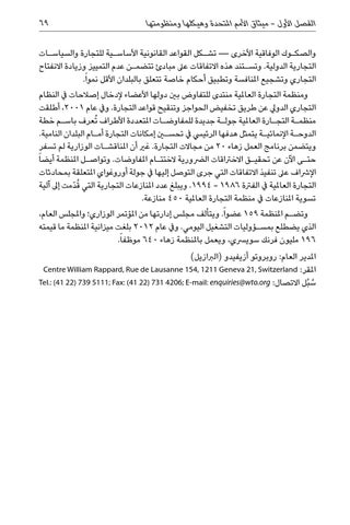والصك�وك الوفاقية األخرى — تش�كل القواعد القانونية األساس�ية للتجارة والسياس�ات التجارية الدولية .وتس�تند هذه االتفاقات عىل مبادئ تتضم�ن عدم التمييز وزيادة االنفتاح التجاري وتشجيع املنافسة وتطبيق أحكام خاصة تتعلق بالبلدان األقل نمواً. ومنظمة التجارة العاملية منتدى للتفاوض بني دولها األعضاء إلدخال إصالحات يف النظام التجاري الدويل عن طريق تخفيض الحواجز وتنقيح قواعد التجارة .ويف عام ،2001أطلقت منظم�ة التج�ارة العاملية جول�ة جديدة للمفاوض�ات املتعددة األطراف ُتعرف باس�م خطة الدوح�ة اإلنمائي�ة يتمثل هدفها الرئييس يف تحسين إمكانات التجارة أم�ام البلدان النامية. ويتضمن برنامج العمل زهاء 20من مجاالت التجارة .غري أن املناقش�ات الوزارية لم تسفر حت�ى اآلن عن تحقي�ق االخرتاقات الرضورية الختت�ام املفاوضات .وتواص�ل املنظمة أيضا ً اإلرشاف عىل تنفيذ االتفاقات التي جرى التوصل إليها يف جولة أوروغواي املتعلقة بمحادثات التجارة العاملية يف الفرتة .1994 - 1986ويبلغ عدد املنازعات التجارية التي ُقدّمت إىل آلية تسوية املنازعات يف منظمة التجارة العاملية 450منازعة. وتض�م املنظمة 159عضواً .ويتألف مجلس إدارتها من املؤتمر الوزاري؛ واملجلس العام، الذي يضطلع بمس�ؤوليات التشغيل اليومي .ويف عام 2012بلغت ميزانية املنظمة ما قيمته 196مليون فرنك سويرسي ،ويعمل باملنظمة زهاء 640موظفاً. املدير العام :روبروتو أزيفيدو (الربازيل) املقرCentre William Rappard, Rue de Lausanne 154, 1211 Geneva 21, Switzerland : س ُبل االتصالTel.: (41 22) 739 5111; Fax: (41 22) 731 4206; E-mail: enquiries@wto.org : ُ