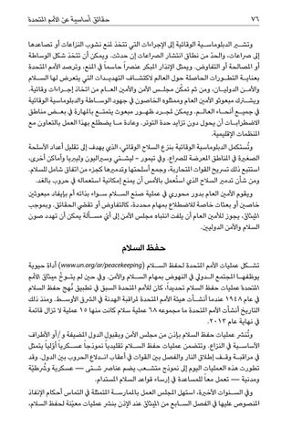 حفظ السالم تش�كل عمليات األمم املتحدة لحفظ السلام ( )www.un.org/ar/peacekeepingأداة حيوية ْ يت�وخ ميثاق األمم يوظفه�ا املجتمع ال�دويل يف النهوض بمهام السلام واألمن .ويف حني لم ُ املتحدة عمليات حفظ السالم تحديداً ،كان لألمم املتحدة السبق يف تطبيق نهج حفظ السالم يف عام 1948عندما أنش�أت هيئة األمم املتحدة ملراقبة الهدنة يف الرشق األوس�ط .ومنذ ذلك التاريخ أنشأت األمم املتحدة ما مجموعه 68عملية سالم كانت منها 15عملية ال تزال قائمة يف نهاية عام .2013 و ُتنرش عمليات حفظ السالم بإذن من مجلس األمن وبقبول الدول املضيفة و/أو األطراف األساس�ية يف النزاع .وتتضمن عمليات حفظ السلام تقليديا ً نموذجا ً عس�كريا ً أ ّوليا ً يتمثل يف مراقب�ة وق�ف إطالق النار والفصل بني القوات يف أعقاب ان�دالع الحروب بني الدول .وقد تطورت هذه العمليات اليوم إىل نموذج متش�عب يضم عنارص ش�تى — عسكرية وشرُ طيّة ومدنية — تعمل معا ً للمساعدة يف إرساء قواعد السالم املستدام. ويف الس�نوات األخرية ،استهل املجلس العمل باملمارس�ة املتمثلة يف التماس أحكام اإلنفاذ املنصوص عليها يف الفصل الس�ابع من امليثاق عند اإلذن بنرش عمليات معيّنة لحفظ السالم،