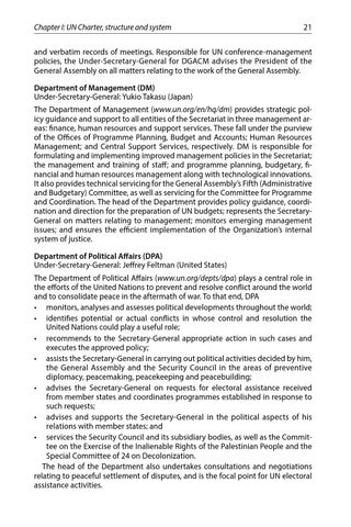 and verbatim records of meetings. Responsible for UN conference-management policies, the Under-Secretary-General for DGACM advises the President of the General Assembly on all matters relating to the work of the General Assembly. Department of Management (DM) Under-Secretary-General: Yukio Takasu (Japan) The Department of Management (www.un.org/en/hq/dm) provides strategic policy guidance and support to all entities of the Secretariat in three management areas: finance, human resources and support services. These fall under the purview of the Offices of Programme Planning, Budget and Accounts; Human Resources Management; and Central Support Services, respectively. DM is responsible for formulating and implementing improved management policies in the Secretariat; the management and training of staff; and programme planning, budgetary, financial and human resources management along with technological innovations. It also provides technical servicing for the General Assembly’s Fifth (Administrative and Budgetary) Committee, as well as servicing for the Committee for Programme and Coordination. The head of the Department provides policy guidance, coordination and direction for the preparation of UN budgets; represents the SecretaryGeneral on matters relating to management; monitors emerging management issues; and ensures the efficient implementation of the Organization’s internal system of justice. Department of Political Affairs (DPA) Under-Secretary-General: Jeffrey Feltman (United States) The Department of Political Affairs (www.un.org/depts/dpa) plays a central role in the efforts of the United Nations to prevent and resolve conflict around the world and to consolidate peace in the aftermath of war. To that end, DPA •• monitors, analyses and assesses political developments throughout the world; •• identifies potential or actual conflicts in whose control and resolution the United Nations could play a useful role; •• recommends to the Secretary-General appropriate action in such cases and executes the approved policy; •• assists the Secretary-General in carrying out political activities decided by him, the General Assembly and the Security Council in the areas of preventive diplomacy, peacemaking, peacekeeping and peacebuilding; •• advises the Secretary-General on requests for electoral assistance received from member states and coordinates programmes established in response to such requests; •• advises and supports the Secretary-General in the political aspects of his relations with member states; and •• services the Security Council and its subsidiary bodies, as well as the Committee on the Exercise of the Inalienable Rights of the Palestinian People and the Special Committee of 24 on Decolonization. The head of the Department also undertakes consultations and negotiations relating to peaceful settlement of disputes, and is the focal point for UN electoral assistance activities.