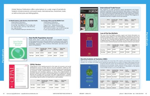 United Nations Publications offers subscriptions to a wide range of periodicals. Subjects include economic and social issues, international law, investment, trade, as well as directories and bibliographies.