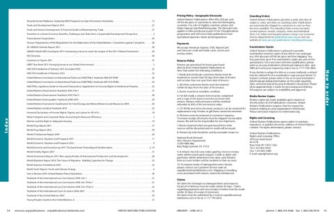 Standing Orders United Nations Publications provides a wide selection of subjects, series and titles on standing order. Publications are automatically shipped to customers as soon as they become available. The Standing Order service includes several options: overall, category, series and individual titles. For orders and inquiries please contact our Customer Service department at publications@un.org or visit our website at www.un.org/ publications/standingorder.aspx. Examination Copies United Nations Publications is pleased to provide examination (review) copies of any title in our catalogue at a 50% discount off the list price and free shipping. You may purchase up to five examination copies per year at this special price. Once you have selected a publication, please write us on your institution’s letterhead stating its title, and ISBN and send your request by mail or fax to 1-717-794-3803. If you decide to adopt the title as a course textbook, a refund may be claimed for the examination copy you purchased. To request a refund, please write or fax us on your institution’s letterhead providing information on the order (quantity, date, semester) placed by your institution’s bookstore. Please allow approximately 2 weeks for processing and delivery. All requests are subject to availability and approval. Media Review Copies Review copies are made available upon request at the discretion of UN Publications. However, United Nations Publications requires that the request be made in writing on your organization’s letterhead. Please send your requests to: reviews@un.org