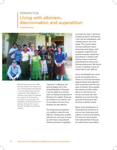 to protect my eyes. I also have troubles at school. Sometimes I can’t see the blackboard, and I always have to sit in the shade. This country does not have sufficient visionenhancing technology, such as glasses, magnifiers and special computer equipment, and without it children with albinism have a hard time graduating from school and finding employment. My family is poor, so getting money for school fees is also difficult.