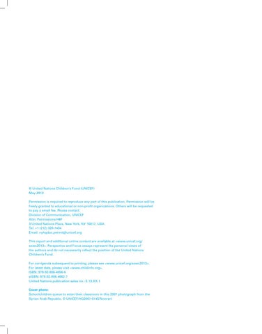 © United Nations Children’s Fund (UNICEF) May 2013 Permission is required to reproduce any part of this publication. Permission will be freely granted to educational or non-profit organizations. Others will be requested to pay a small fee. Please contact: Division of Communication, UNICEF Attn: Permissions H6F 3 United Nations Plaza, New York, NY 10017, USA Tel: +1 (212) 326-7434 Email: nyhqdoc.permit@unicef.org This report and additional online content are available at <www.unicef.org/ sowc2013>. Perspective and Focus essays represent the personal views of the authors and do not necessarily reflect the position of the United Nations Children’s Fund. For corrigenda subsequent to printing, please see <www.unicef.org/sowc2013>. For latest data, please visit <www.childinfo.org>. ISBN: 978-92-806-4656-6 eISBN: 978-92-806-4662-7 United Nations publication sales no.: E.13.XX.1 Cover photo: Schoolchildren queue to enter their classroom in this 2007 photograph from the Syrian Arab Republic. © UNICEF/HQ2007-0745/Noorani