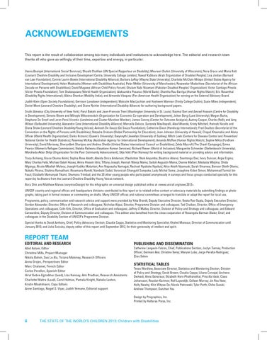 ACKNOWLEDGEMENTS This report is the result of collaboration among too many individuals and institutions to acknowledge here. The editorial and research team thanks all who gave so willingly of their time, expertise and energy, in particular: Vesna Bosnjak (International Social Services); Shuaib Chalklen (UN Special Rapporteur on Disability); Maureen Durkin (University of Wisconsin); Nora Groce and Maria Kett (Leonard Cheshire Disability and Inclusive Development Centre, University College London); Nawaf Kabbara (Arab Organization of Disabled People); Lisa Jordan (Bernard van Leer Foundation); Connie Laurin-Bowie (International Disability Alliance); Barbara LeRoy (Wayne State University); Charlotte McClain-Nhlapo (United States Agency for International Development); Helen Meekosha (Women with Disabilities Australia); Peter Mittler (University of Manchester); Roseweter Mudarikwa (Secretariat of the African Decade on Persons with Disabilities); David Mugawe (African Child Policy Forum); Ghulam Nabi Nizamani (Pakistan Disabled Peoples’ Organization); Victor Santiago Pineda (Victor Pineda Foundation); Tom Shakespeare (World Health Organization); Aleksandra Posarac (World Bank); Shantha Rau Barriga (Human Rights Watch); Eric Rosenthal (Disability Rights International); Albina Shankar (Mobility India); and Armando Vásquez (Pan American Health Organization) for serving on the External Advisory Board. Judith Klein (Open Society Foundations); Gerrison Lansdown (independent); Malcolm MacLachlan and Hasheem Mannan (Trinity College Dublin); Susie Miles (independent); Daniel Mont (Leonard Cheshire Disability); and Diane Richler (International Disability Alliance) for authoring background papers. Sruthi Atmakur (City University of New York); Parul Bakshi and Jean-Francois Trani (Washington University in St. Louis); Nazmul Bari and Amzad Hossain (Centre for Disability in Development); Simone Bloem and Mihaylo Milovanovitch (Organization for Economic Co-operation and Development); Johan Borg (Lund University); Megan Burke, Stephane De Greef and Loren Persi Vicentic (Landmine and Cluster Munition Monitor); James Conroy (Center for Outcome Analysis); Audrey Cooper, Charles Reilly and Amy Wilson (Gallaudet University); Alexandre Cote (International Disability Alliance); Marcella Deluca, Sunanda Mavillapalli, Alex Mhando, Kristy Mitchell, Hannah Nicolls and Diana Shaw (Leonard Cheshire Disability/Young Voices); Avinash De Souza (De Souza Foundation); Catherine Dixon (Handicap International); Fred Doulton (Secretariat of the Convention on the Rights of Persons with Disabilities); Natasha Graham (Global Partnership for Education); Jean Johnson (University of Hawaii); Chapal Khasnabis and Alana Officer (World Health Organization); Darko Krznaric (Queen’s University); Gwynnyth Llewellyn (University of Sydney); Mitch Loeb (Centers for Disease Control and Prevention/ National Center for Health Statistics); Rosemay McKay (Australian Agency for International Development); Amanda McRae (Human Rights Watch); Sophie Mitra (Fordham University); David Morissey, Sherzodbek Sharipoo and Andrea Shettle (United States International Council on Disabilities); Zelda Mycroft (The Chaeli Campaign); Emma Pearce (Women’s Refugee Commission); Natalia Raileanu (Keystone Human Services); Richard Rieser (World of Inclusion); Marguerite Schneider (Stellenbosch University); Morsheda Akter Shilpi (Organization for the Poor Community Advancement); Silje Vold (Plan Norway) for writing background material or providing advice and information. Tracy Achieng; Grace Okumu Akimi; Sophia Rose Akoth; Abeida Onica Anderson; Washinton Okok Anyumba; Beatrice Atieno; Ssentongo Deo; Ivory Duncan; Argie Ergina; Mary Charles Felix; Michael Salah Hosea; Amna Hissein Idris; Tiffany Joseph; Hannah Wanja Maina; Saitoti Augustin Maina; Dianne Mallari; Modesta Mbijima; Shida Mganga; Nicole Mballah Mulavu; Joseph Kadiko Mutunkei; Ann Napaashu Nemagai; Rachael Nyaboke Nyabuti; Alice Akoth Nyamuok; Sarah Omanwa; Benson Okoth Otieno; Nakafu Phiona; Shalima Ramadhani; Rosemarie Ramitt; Nambobi Sadat; Veronicah Shangutit Sampeke; Ladu Michel Seme; Josephine Kiden Simon; Muhammad Tarmizi bin Fauzi; Elizabeth Mamunyak Tikami; Shemona Trinidad; and the 20 other young people who participated anonymously in surveys and focus groups conducted specially for this report by facilitators from the Leonard Cheshire Disability Young Voices network. Bora Shin and Matthew Manos (veryniceDesign) for the infographic on universal design published online at <www.unicef.org/sowc2013>. UNICEF country and regional offices and headquarters divisions contributed to this report or to related online content or advocacy materials by submitting findings or photographs, taking part in formal reviews or commenting on drafts. Many UNICEF offices and national committees arranged to translate or adapt the report for local use. Programme, policy, communication and research advice and support were provided by Yoka Brandt, Deputy Executive Director; Geeta Rao Gupta, Deputy Executive Director; Gordon Alexander, Director, Office of Research and colleagues; Nicholas Alipui, Director, Programme Division and colleagues; Ted Chaiban, Director, Office of Emergency Operations and colleagues; Colin Kirk, Director, Office of Evaluation and colleagues; Jeffrey O’Malley, Director, Division of Policy and Strategy and colleagues; and Edward Carwardine, Deputy Director, Division of Communication and colleagues. This edition also benefited from the close cooperation of Rosangela Berman-Bieler, Chief, and colleagues in the Disability Section of UNICEF’s Programme Division. Special thanks to David Anthony, Chief, Policy Advocacy Section; Claudia Cappa, Statistics and Monitoring Specialist; Khaled Mansour, Director of Communication until January 2013; and Julia Szczuka, deputy editor of this report until September 2012, for their generosity of intellect and spirit.