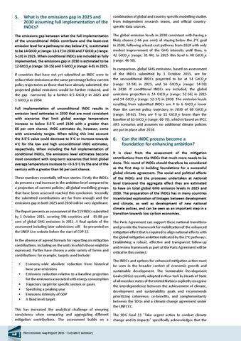 6. Can the INDC process become a foundation for enhancing ambition? It is clear from the assessment of the mitigation contributions from the INDCs that much more needs to be done. This round of INDCs should therefore be considered as the first step in building foundations for a successful global climate agreement. The social and political effects of the INDCs and the processes undertaken at national level transcend the aggregate effect they are estimated to have on total global GHG emission levels in 2025 and 2030. The preparation of the INDCs has in many countries incentivized exploration of linkages between development and climate, as well as development of new national climate polices, and can be seen as an important step in a transition towards low carbon economies. The Paris Agreement can support these national transitions and provide the framework for mobilization of the enhanced mitigation effort that is required to align national efforts with the global mitigation ambition indicated by the 2°C pathways. Establishing a robust, effective and transparent follow-up and review framework as part of the Paris Agreement will be critical in this context. The INDCs and options for enhanced mitigation action must be seen in the broader context of economic growth and sustainable development. The Sustainable Development Goals (SDGs) recently adopted in New York by Heads of State of all member states of the United Nations explicitly recognise the interdependence between the achievement of climate, development and sustainability goals and recommends prioritizing coherence, co-benefits, and complementarity between the SDGs and a climate change agreement under the UNFCCC. The SDG Goal 13 “Take urgent action to combat climate change and its impacts” specifically acknowledges that the