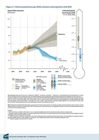 Left hand panel: Historical GHG from CAIT* (dashed line), PRIMAP** (solid line), and EDGAR*** (dotted line) – all excluding biomass-burning emissions. The solid line surrounded by the brown-shaded area shows the EDGAR estimates when including large-scale biomass burning emission estimates as in IPCC AR5 WG3****, and their overall 90% uncertainty range. Projections are drawn from the IPCC AR5 Scenario Database and show baselines (grey) and scenarios limiting warming to below 2°C by 2100 with at least a likely (>66%) chance (blue). The 2°C scenarios start from 2020 levels and assume a global least-cost pathway afterwards. Data for these pathways can be found in Table 2.1 under label “2°C (>66% in 2100)”, along with other temperature target definitions. For each subset the median (solid line), the 20-80% range (dark) and the min-max range (lighter) of Kyoto-GHG emissions are shown. Right hand panel: Estimated global temperature increase in 2100 of both scenario subsets. The climate uncertainty represents the 90% range of carbon-cycle and climate response uncertainty, as used in the IPCC AR5 WGIII assessment. Kyoto-GHG emissions are aggregated using 100-year Global Warming Potentials reported in the IPCC Second Assessment Report. SOURCES: * CAIT: World Resource Institute (WRI). http://www.wri.org/resources/data-sets/cait-historical-emissions-data-countries-us-states-unfccc ** PRIMAP4 baseline: Potsdam Institute for Climate Impact Research (PIK). https://www.pik-potsdam.de/research/climate-impacts-and-vulnerabilities/research/ rd2-flagship-projects/primap/emissions-module *** EDGAR: European Commission, Joint Research Centre (JRC)/ Netherlands Environmental Assessment Agency (PBL). Emission Database for Global Atmospheric Research (EDGAR) version 4.3. http://edgar.jrc.ec.europa.eu/, 2015 update (forthcoming), (Olivier and Janssens-Maenhout, 2012). **** based on updates of van der Werf et al. (2010).