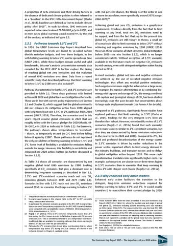 with >66 per cent chance, the timing is of the order of one or more decades later, more specifically around 2070 (range: 2060-2075)12. Achieving global net zero CO2 emissions is a geophysical requirement. It follows directly from the fact that to limit warming to any level, total net CO2 emissions need to be capped, and from the fact that, up to the present day, global CO2 emissions are still rising13. In theory, a small set of scenarios is able to limit warming to below 2°C14 without achieving net negative emissions by 2100 (UNEP, 2014). However, these scenarios all start stringent, global mitigation before 2020 (see also Section 2.2.3), which is no longer considered realistic. Without exception, all 1.5°C scenarios available in the literature reach net negative CO2 emissions by mid-century, even with stringent mitigation action having started in 2010. In most scenarios, global net zero and negative emissions are achieved by the use of so-called negative emission technologies that offset any residual positive emissions. Such negative emissions might be achieved on a large scale, for example, by massive afforestation or by combining bioenergy with capture and storage of CO2. Bio-energy combined with capture and geological storage of CO2 has been studied increasingly over the past decade, but uncertainties about its large-scale deployment remain (see Annex A for details). Compared to 2°C pathways, significantly fewer studies have explored pathways that limit warming to 1.5°C (Clarke et al., 2014). Findings for the very stringent 1.5°C limit are therefore less robust. However, one scientific review of 1.5°C scenarios (Rogelj et al., 2015a) found that such scenarios are in many aspects similar to 2°C-consistent scenarios, but that they are characterized by faster emissions reductions in the near term (in 2020 and 2030). Compared to 2°C, the rapid and profound decarbonization of the energy system in 1.5°C scenarios is driven by earlier reductions in the power sector, important efforts to limit energy demand in the industry, buildings, and transport sector; and no delays in global mitigation action beyond 2020. This more rapid transformation translates into significantly higher costs. For example, carbon prices are about two or three times higher in 1.5°C scenarios than in scenarios that keep warming to below 2°C with >66 per cent chance (Rogelj et al., 2015a).