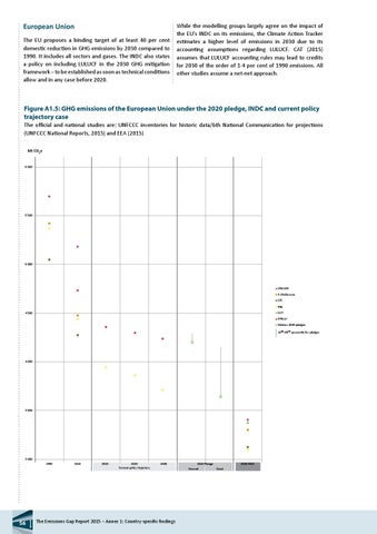 Figure A1.5: GHG emissions of the European Union under the 2020 pledge, INDC and current policy trajectory case The official and national studies are: UNFCCC inventories for historic data/6th National Communication for projections EU28 (UNFCCC National Reports, 2015) and EEA (2015) Mt CO2e 6 000