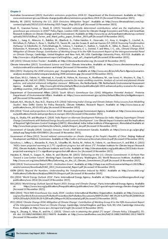 Chapter 3 Australian Government (2015) ‘Australia’s emissions projections 2014-15’. Department of the Environment. Available at: http:// www.environment.gov.au/climate-change/publications/emissions-projections-2014-15 [Accessed 10 November 2015]. Belenky, M. (2015) ‘Achieving the U.S. 2025 Emissions Mitigation Target’. Available at: http://www.climateadvisers.com/wpcontent/uploads/2013/12/US-Achieving-2025-Target_May-20151.pdf [Accessed 10 November 2015]. Boyd, R., Cranston-Turner, J., Ward, B. (2015) ‘Intended nationally determined contributions: what are the implications for greenhouse gas emissions in 2030?’ Policy Paper, London: ESRC Centre for Climate Change Economics and Policy and Grantham Research Institute on Climate Change and the Environment. Available at: http://www.lse.ac.uk/GranthamInstitute/wp-content/ uploads/2015/10/Boyd_Turner_and_Ward_policy_paper_October_2015.pdf [Accessed 10 November 2015]. Clarke, L., Jiang, K., Akimoto, K., Babiker, M., Blanford, G., Fisher-Vanden, K., Hourcade, J-C., Krey, V., Kriegler, E., Löschel, A., McCollum, D., Paltsev, S., Rose, S., Shukla, P. R., Tavoni, M., van der Zwaan, B. and van Vuuren, D.P. (2014) ‘Assessing Transformation Pathways’ in Edenhofer, O., Pichs-Madruga, R., Sokona, Y., Farahani, E., Kadner, S., Seyboth, K., Adler, A., Baum, I., Brunner, S., Eickemeier, P., Kriemann, B., Savolainen, J., Schlömer, S., Stechow, C. v., Zwickel, T. and Minx, J. C., eds., Climate Change 2014: Mitigation of Climate Change. Contribution of Working Group III to the Fifth Assessment Report of the Intergovernmental Panel on Climate Change, Cambridge, United Kingdom and New York, NY, USA: Cambridge University Press, 413-510. Available at: http://www.ipcc.ch/pdf/assessment-report/ar5/wg3/ipcc_wg3_ar5_chapter6.pdf [Accessed 10 November 2015]. CAT (2015) ‘Climate Action Tracker’. Available at: http://climateactiontracker.org. [Accessed 10 November 2015]. Climate Interactive (2015) ‘Scoreboard Science and Data’. Climate Interactive. Available at: https://www.climateinteractive.org/ tools/scoreboard/scoreboard-science-and-data/ [Accessed 10 November 2015]. DEA (2015) ‘Analyzing the 2030 emissions gap’. Energistyrelsen. Available at: http://www.ens.dk/en/info/facts-figures/scenariosanalyses-models/models/compare/analyzing-2030-emissions-gap [Accessed 10 November 2015]. den Elzen, M.G.J., Fekete, H., Admiraal, A., Forsell, N., Höhne, N., Korosuo, A., Roelfsema, M., van Soest, H., Wouters, K., Day, T., Hagemann, M., Hof, A.F. (2015). ‘Enhanced policy scenarios for major emitting countries. Analysis of current and planned climate policies, and selected enhanced mitigation measure’. Bilthoven, the Netherlands: PBL Netherlands Environmental Assessment Agency. Available at: http://www.pbl.nl/sites/default/files/cms/publicaties/pbl-2015-enhanced-policy-scenarios-for-majoremitting-countries_1631.pdf [Accessed 10 November 2015]. Department of Environmental Affairs (2014) ‘South Africa’s Greenhouse Gas (GHG) Mitigation Potential Analysis’. Pretoria: Department of Environmental Affairs. Available at: https://www.environment.gov.za/sites/default/files/docs/mitigationreport. pdf [Accessed 10 November 2015] Dubash, N.K., Khosla, R., Rao, N.D., Sharma, K.R. (2014) ‘Informing India’s Energy and Climate Debate: Policy Lessons from Modelling Studies’. New Delhi: Centre for Policy Research, Climate Initiative, Research Report. Available at: http://www.iiasa.ac.at/ publication/more_XO-15-012.php [Accessed 10 November 2015] EEA (2014) ‘Trends and projections in Europe 2014’. Brussels: European Environment Agency. Available at: http://www.eea.europa. eu/publications/trends-and-projections-in-europe-2014 [Accessed 10 November 2015] Garg, A., Shukla, P.R. and Bhushan K. (2014) ‘India Report on Alternate Development Pathways for India: Aligning Copenhagen Climate Change Commitments with National Energy Security and Economic Development’. Low Climate Impact Scenarios and the Implications of Required Tight Emission Control Strategies [LIMITS]. Ahmedabad, India: Indian Institute of Management, Ahmedabad Available at: http://www.feem-project.net/limits/docs/limits_india%20report_iim.pdf [Accessed 10 November 2015] Government of Canada (2014) ‘Canada’s Emission Trends 2014’. Environment Canada. Available at: https://www.ec.gc.ca/ges-ghg/ default.asp?lang=En&n=E0533893-1 [Accessed 10 November 2015]. Government of China (2012) ‘Second national communication on climate change of the People’s Republic of China’. Beijing: National Development and Reform Commission. Available at: http://unfccc.int/resource/docs/natc/chnnc2e.pdf [Accessed 10 November 2015]. Gütschow, J., Jeffery, L., Alexander, R., Hare, B., Schaeffer, M., Rocha, M., Höhne, N., Fekete, H., van Breevoort, P., and Blok, K. (2015) ‘INDCs lower projected warming to 2.7°C: significant progress but still above 2°C’. Potsdam Institute for Climate Impact Research (PIK), Climate Analytics, NewClimate Institute and Ecofys. Available at: http://climateanalytics.org/publications/2015/indcs-lowerprojected-warming-to-2-7-c-significant-progress-but-still-above-2oc [Accessed 10 November 2015]. Hausker, K., Meek, K., Gasper, R., Aden, N. and Obeiter, M. (2015) ‘Delivering on the U.S. Climate Commitment: A 10-Point Plan Toward a Low-Carbon Future’. Working Paper. Executive Summary. Washington, DC: World Resources Institute. Available at: http://www.wri.org/sites/default/files/Delivering_on_the_US_Climate_Commitment_ES.pdf [Accessed 10 November 2015]. ICAO (2013) ‘Environmental Report 2013 - Destination Green’. Available at: http://cfapp.icao.int/Environmental-Report-2013/files/ assets/common/downloads/ICAO_2013_Environmental_Report.pdf [Accessed 10 November 2015]. IDDRI (2015) ‘Beyond the Numbers: Understanding the Transformation Induced by INDCs’. Available at: http://www.iddri.org/ Publications/Collections/Analyses/MILES%20report.pdf [Accessed 10 Novembe