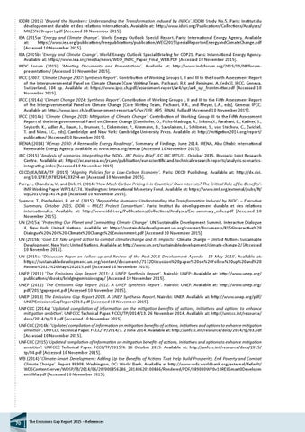 IDDRI (2015) ‘Beyond the Numbers: Understanding the Transformation Induced by INDCs’. IDDRI Study No.5. Paris: Institut du développement durable et des relations internationals. Available at: http://www.iddri.org/Publications/Collections/Analyses/ MILES%20report.pdf [Accessed 10 November 2015]. IEA (2015a) ‘Energy and Climate Change’. World Energy Outlook Special Report. Paris: International Energy Agency. Available at: https://www.iea.org/publications/freepublications/publication/WEO2015SpecialReportonEnergyandClimateChange.pdf [Accessed 10 November 2015]. IEA (2015b) ‘Energy and Climate Change’. World Energy Outlook Special Briefing for COP21. Paris: International Energy Agency. Available at: https://www.iea.org/media/news/WEO_INDC_Paper_Final_WEB.PDF [Accessed 10 November 2015]. INDC Forum (2015): ‘Meeting Documents and Presentations’. Available at: http://www.indcforum.org/2015/10/08/forumpresentations/ [Accessed 10 November 2015]. IPCC (2007) ‘Climate Change 2007: Synthesis Report’. Contribution of Working Groups I, II and III to the Fourth Assessment Report of the Intergovernmental Panel on Climate Change [Core Writing Team, Pachauri, R.K and Reisinger, A. (eds.)]. IPCC, Geneva, Switzerland, 104 pp. Available at: https://www.ipcc.ch/pdf/assessment-report/ar4/syr/ar4_syr_frontmatter.pdf [Accessed 10 November 2015]. IPCC (2014a) ‘Climate Change 2014: Synthesis Report’. Contribution of Working Groups I, II and III to the Fifth Assessment Report of the Intergovernmental Panel on Climate Change [Core Writing Team, Pachauri, R.K., and Meyer, L.A., eds]. Geneva: IPCC. Available at: http://www.ipcc.ch/pdf/assessment-report/ar5/syr/SYR_AR5_FINAL_full.pdf [Accessed 10 November 2015]. IPCC (2014b) ‘Climate Change 2014: Mitigation of Climate Change’. Contribution of Working Group III to the Fifth Assessment Report of the Intergovernmental Panel on Climate Change [Edenhofer, O., Pichs-Madruga, R., Sokona,Y., Farahani, E., Kadner, S., Seyboth, K., Adler, A., Baum, I., Brunner, S., Eickemeier, P., Kriemann, B., Savolainen, J., Schlömer, S., von Stechow, C., Zwickel, T. and Minx, J.C., eds]. Cambridge and New York: Cambridge University Press. Available at: http://mitigation2014.org/report/ publication/ [Accessed 10 November 2015]. IRENA (2014) ‘REmap 2030: A Renewable Energy Roadmap’, Summary of Findings, June 2014. IRENA, Abu Dhabi: International Renewable Energy Agency. Available at: www.irena.org/remap [Accessed 10 November 2015]. JRC (2015) ‘Analysis of scenarios integrating the INDCs. JRC Policy Brief’. EC JRC IPTS/J1. October 2015. Brussels: Joint Research Centre. Available at: https://ec.europa.eu/jrc/en/publication/eur-scientific-and-technical-research-reports/analysis-scenariosintegrating-indcs [Accessed 10 November 2015] OECD/IEA/NEA/ITF (2015) ‘Aligning Policies for a Low-Carbon Economy’. Paris: OECD Publishing. Available at: http://dx.doi. org/10.1787/9789264233294-en [Accessed 10 November 2015]. Parry, I., Chandara, V., and Dirk, H. (2014) ‘How Much Carbon Pricing is in Countries’ Own Interests? The Critical Role of Co-Benefits’. IMF Working Paper WP/14/174. Washington: International Monetary Fund. Available at: https://www.imf.org/external/pubs/ft/ wp/2014/wp14174.pdf [Accessed 10 November 2015]. Spencer, T., Pierfederici, R. et al. (2015): ‘Beyond the Numbers: Understanding the Transformation Induced by INDCs – Executive Summary, October 2015, IDDRI – MILES Project Consortium’. Paris: Institut du développement durable et des relations internationales. Available at: http://www.iddri.org/Publications/Collections/Analyses/Exe-summary_miles.pdf [Accessed 10 November 2015]. UN (2015a) ‘Protecting Our Planet and Combatting Climate Change’, UN Sustainable Development Summit. Interactive Dialogue 4, New York: United Nations. Available at: https://sustainabledevelopment.un.org/content/documents/8156Interactive%20 Dialogue%20%204%20-Climate%20Change%20Environment.pdf [Accessed 10 November 2015]. UN (2015b) ‘Goal 13: Take urgent action to combat climate change and its impacts’. Climate Change – United Nations Sustainable Development. New York: United Nations. Available at: http://www.un.org/sustainabledevelopment/climate-change-2/ [Accessed 10 November 2015]. UN (2015c) ‘Discussion Paper on Follow-up and Review of the Post-2015 Development Agenda - 12 May 2015’. Available at: https://sustainabledevelopment.un.org/content/documents/7132Discussion%20paper%20on%20Follow%20up%20and%20 Review%2012%20May%202015.pdf [Accessed 10 November 2015]. UNEP (2011) ‘The Emissions Gap Report 2011: A UNEP Synthesis Report’. Nairobi: UNEP: Available at: http://www.unep.org/ publications/ebooks/bridgingemissionsgap/ [Accessed 10 November 2015]. UNEP (2012) ‘The Emissions Gap Report 2012. A UNEP Synthesis Report’. Nairobi: UNEP. Available at: http://www.unep.org/ pdf/2012gapreport.pdf [Accessed 10 November 2015]. UNEP (2013) The Emissions Gap Report 2013. A UNEP Synthesis Report. Nairobi: UNEP. Available at: http://www.unep.org/pdf/ UNEPEmissionsGapReport2013.pdf [Accessed 10 November 2015]. UNFCCC (2014a) ‘Updated compilation of information on the mitigation benefits of actions, initiatives and options to enhance mitigation ambition’. UNFCCC Technical Paper. FCCC/TP/2014/13. 26 November 2014. Available at: http://unfccc.int/resource/ docs/2014/tp/13.pdf [Accessed 10 November 2015]. UNFCCC (2014b) ‘Updated compilation of information on mitigation benefits of actions, initiatives and options to enhance mitigation ambition’. UNFCCC Technical Paper. FCCC/TP/2014/3. 2 June 2014. Available at: http://unfccc.int/resource/docs/2014/tp/03.pdf [Accessed 10 November 2015]. UNFCCC (2015) ‘Updated compilation of information on mitigation benefits of actions, initiatives and options to enhance mitigation ambition’. UNFCCC Technical Paper. FCCC/TP/2015/4. 16 October 2015. Available at: http://unfccc.int/resource/docs/2015/ tp/04.pdf [Acce